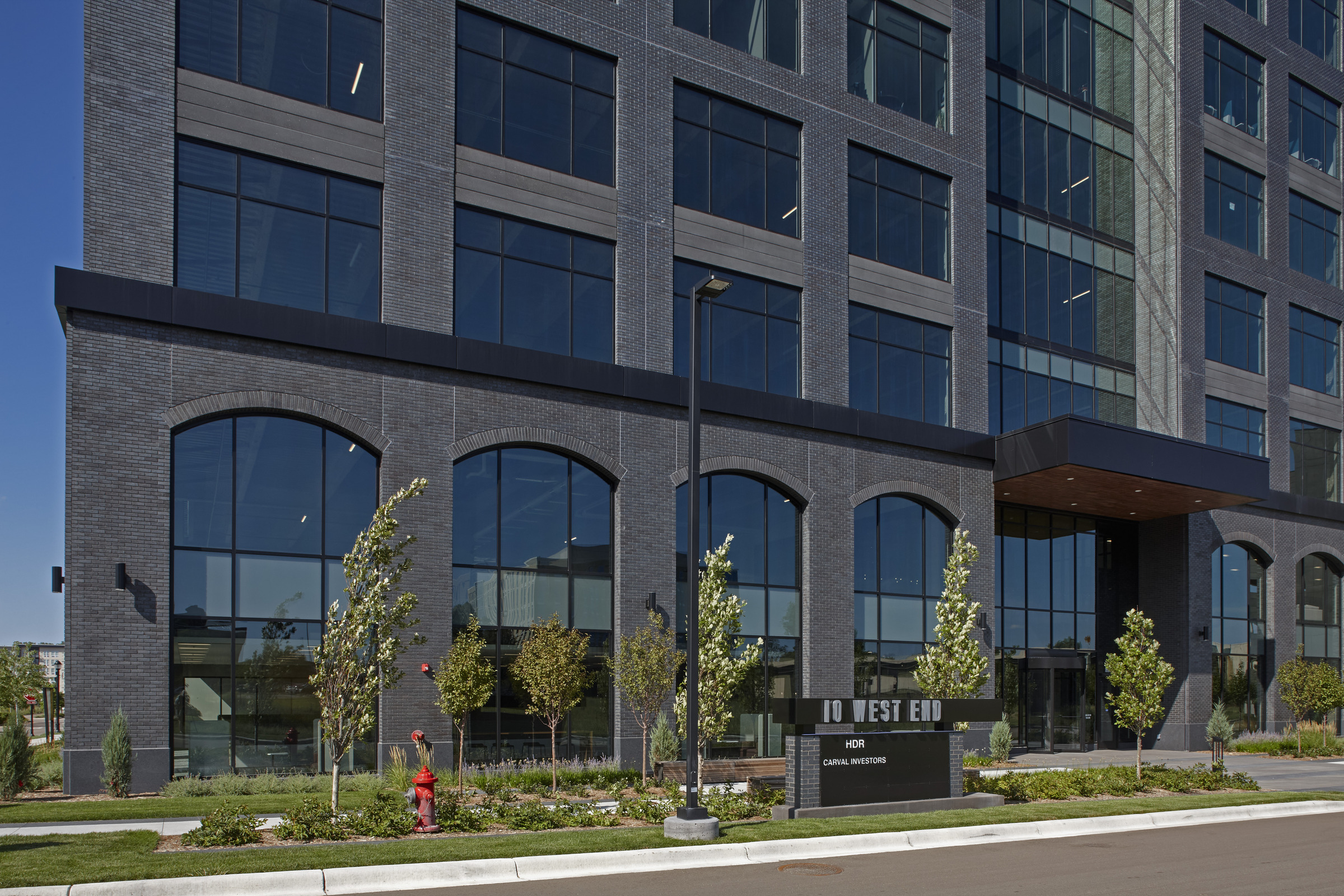 Intentionally located off-center is a vertical glass element to allow for a striking lobby, connecting the plaza to the park, and positioning the site for a future expansion. Wells partnered to provide architectural solutions that elevate the glass elements and establish a clean, modern facade. The cast-in brick adds character to the window arches and creates a modern take on the durability of a brick warehouse.