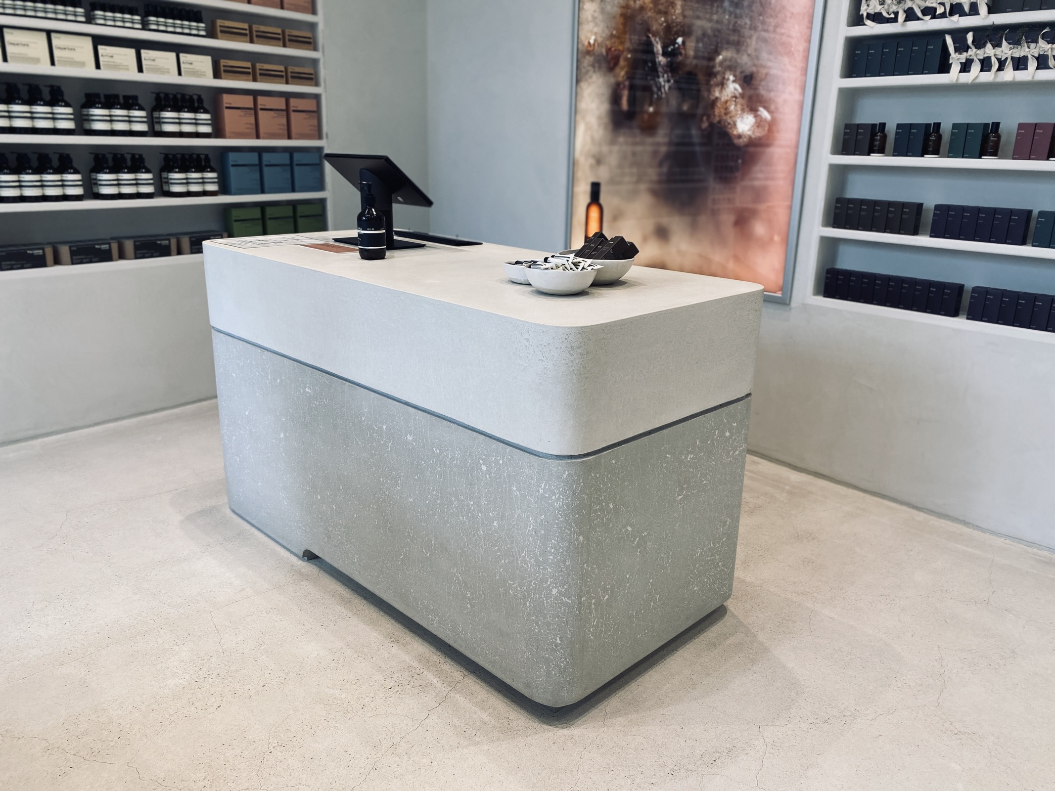 In Aesop’s Miami Design District flagship, Wells created high-performance concrete countertops and a custom-integrated sink using DEX — embodying the brand’s minimalist, tactile aesthetic. Clean, geometric forms and refined finishes nod to the neighborhood’s Art Deco legacy while embracing modern restraint.