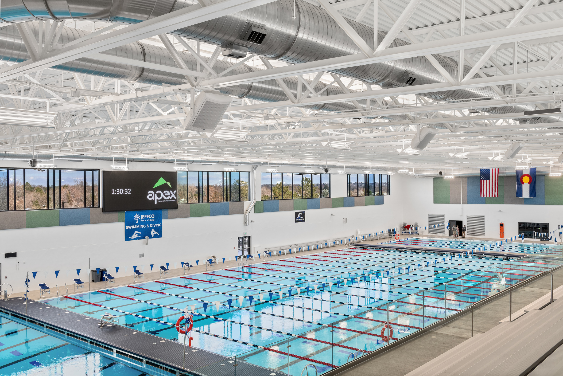 Arvada Aquatics Center is a state-of-the-art natatorium that replaced the former George J. Meyers Swimming Center. The facility now serves as a primary venue for competitive swimming, recreation, and community programming. The new center was constructed on the existing site’s parking lot, allowing the original facility to remain operational throughout most of the construction process. Community input played a vital role in shaping the final design, ensuring the space reflects local needs and priorities.