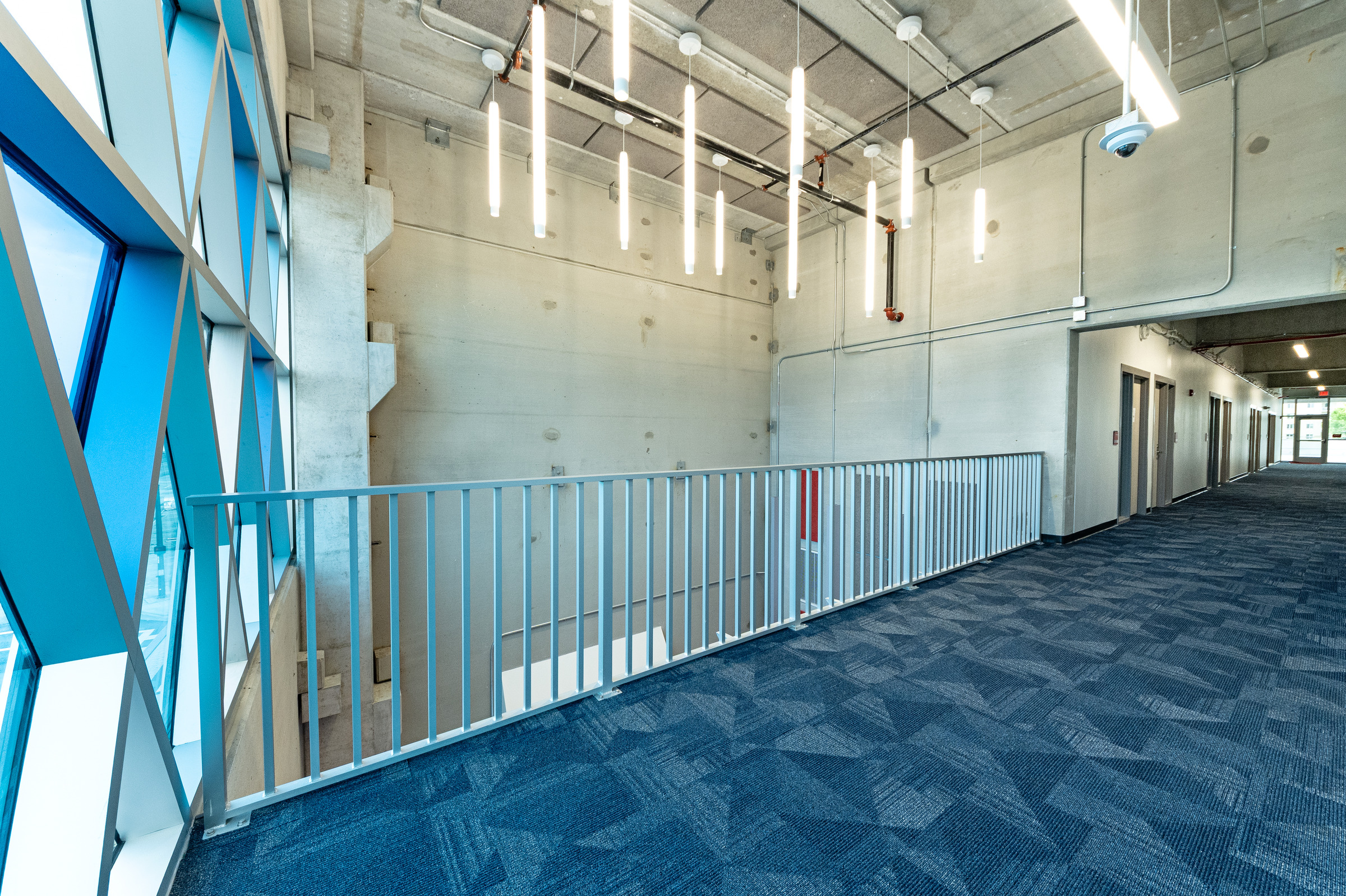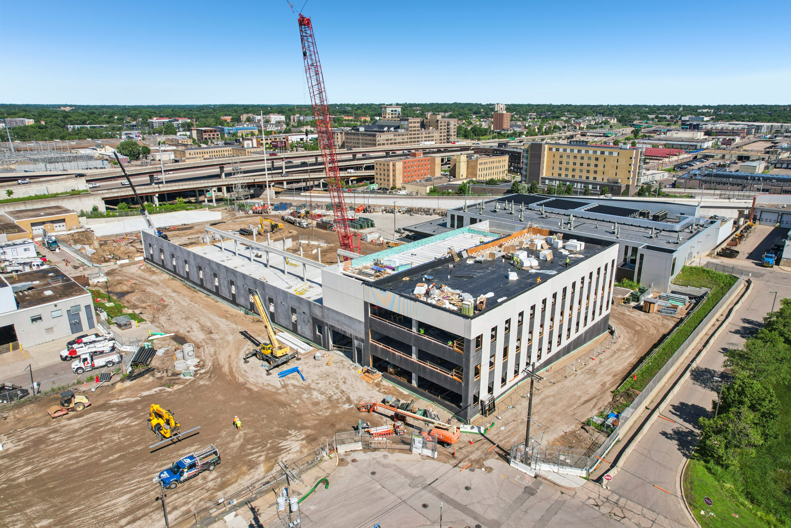 The decision to build entirely with precast concrete proved critical on the dense urban site, where limited access and staging demanded a streamlined construction approach. Wells manufactured form-finished structural precast components in a controlled environment to ensure precision and consistency, then assembled them rapidly on-site to accelerate enclosure and minimize disruption to the surrounding area. This approach delivered a robust structural frame with speed and certainty, while the smooth gray as-cast finish—left exposed on much of the exterior and selectively complemented by red metal screening panels—reinforces an industrial aesthetic embraced by the owner and design team. Portions of the precast will be painted, providing durability today with flexibility for the future.