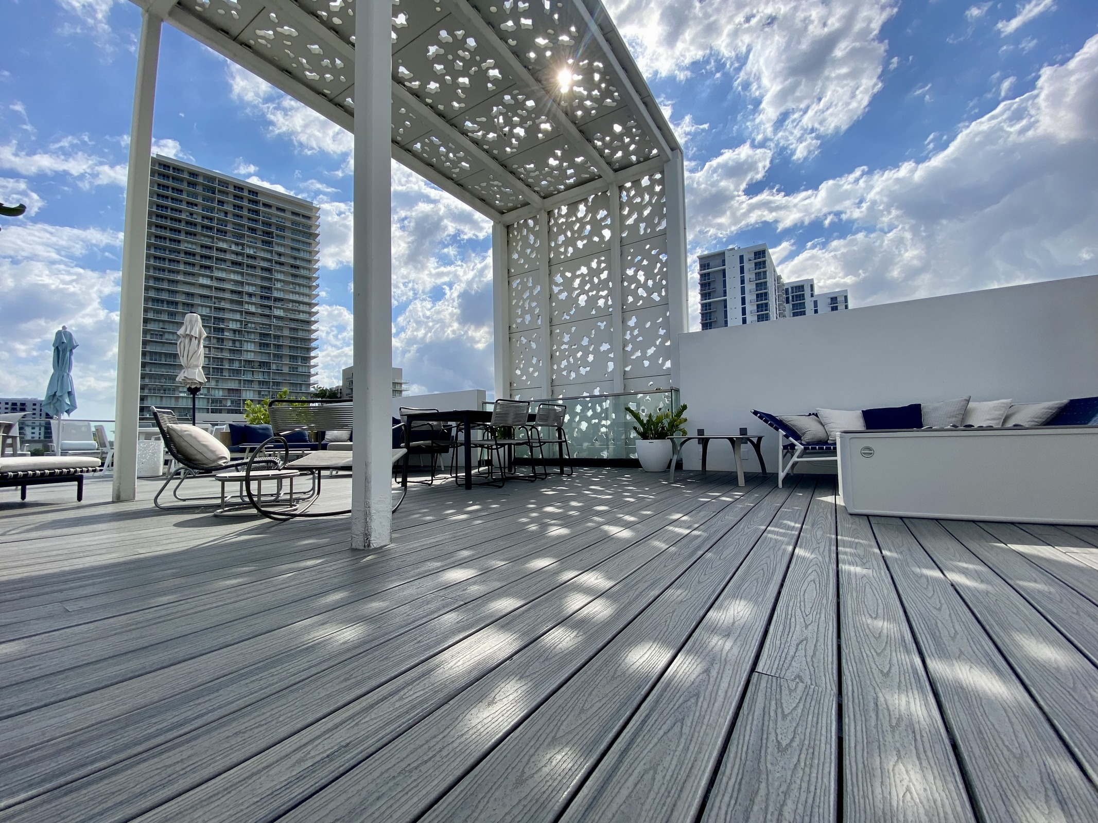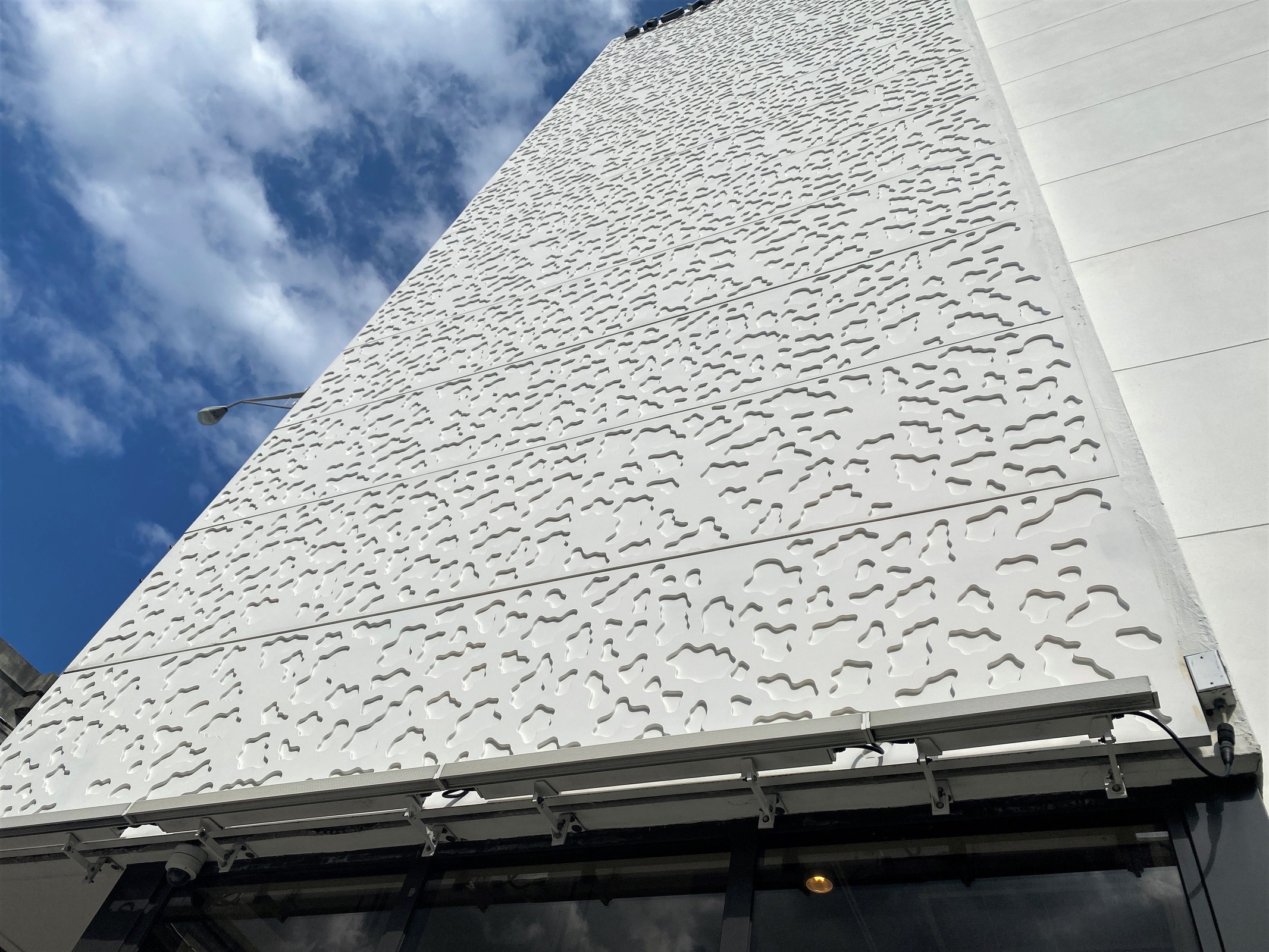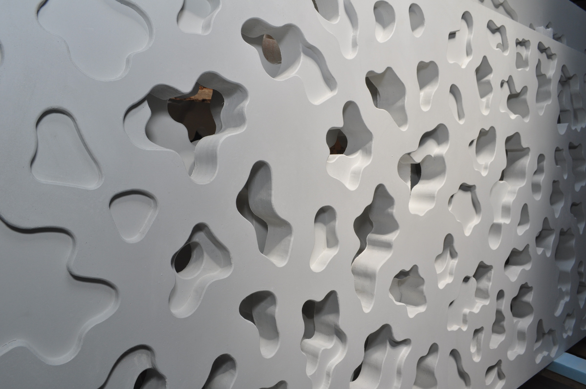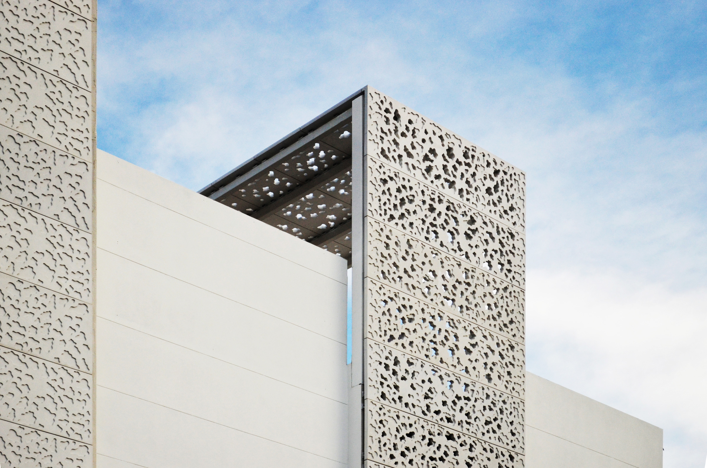 The first level is covered in Florida keystone, the same material as the limestone from the coastal coral bluffs. The taller, alternating plates are covered in perforated high performance concrete panels. The designers worked with Wells, utilizing DEX high performance concrete to create a repeating pattern to reduce the number of forms required, enhancing cost efficiency. The patterns were cut using CNC tooling from digital files provided by Touzet Studio, ensuring precision and accuracy. Rubber forms were then cast from these patterns and used for the project. The revitalized structures is designed for longevity, ensuring it remains a resilient and sustainable feature of the Design District and landscape for years to come.