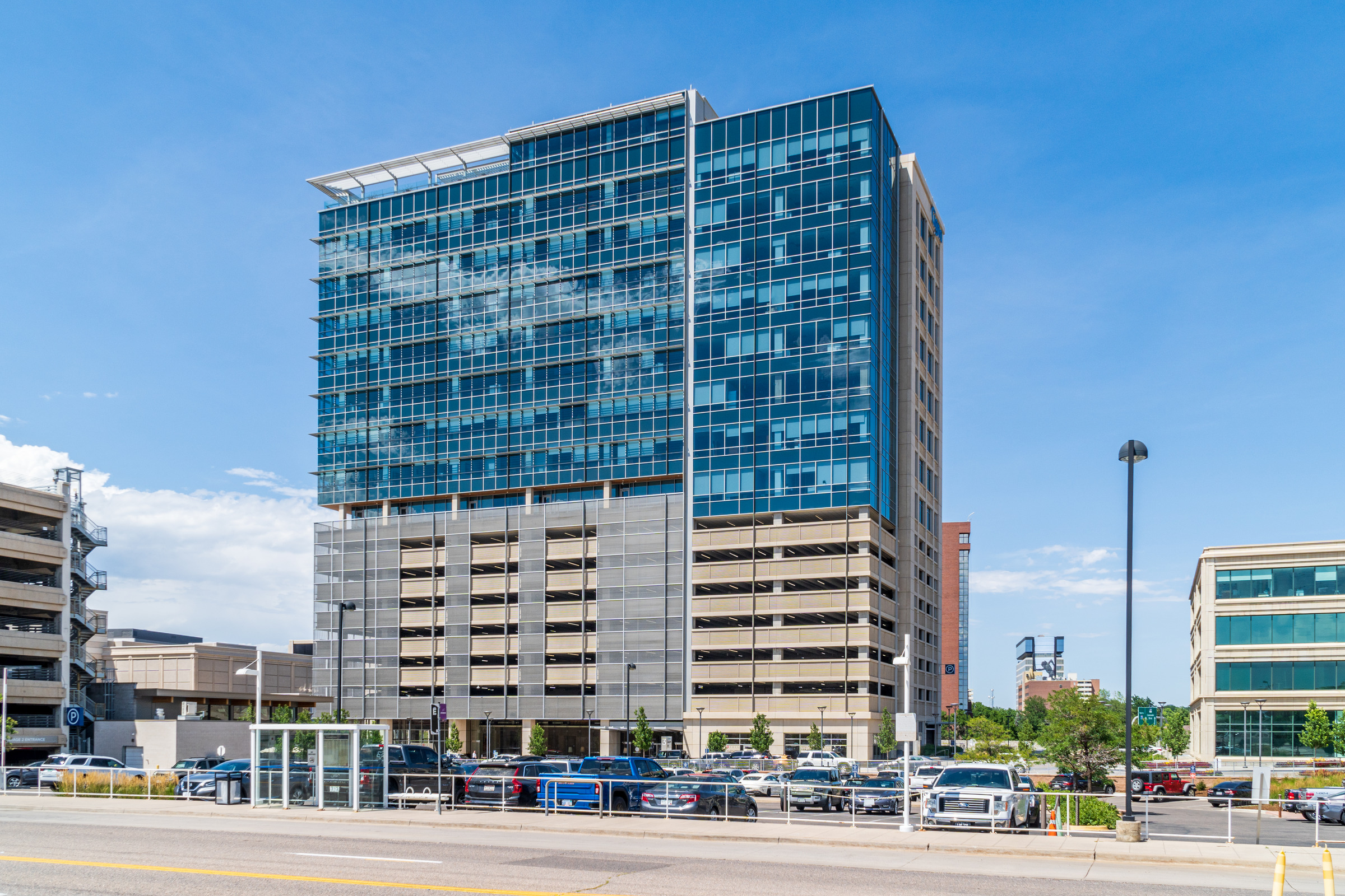 Colorado Center Tower III is a podium-style office tower with ground-level retail, a seven-level parking structure accommodating approximately 400 vehicles and 203,000 sq ft of office space across eight floors, topped by a roof terrace. Part of a 13-acre, mixed-use Transit Oriented Development (TOD), the building is designed for LEED Gold certification.