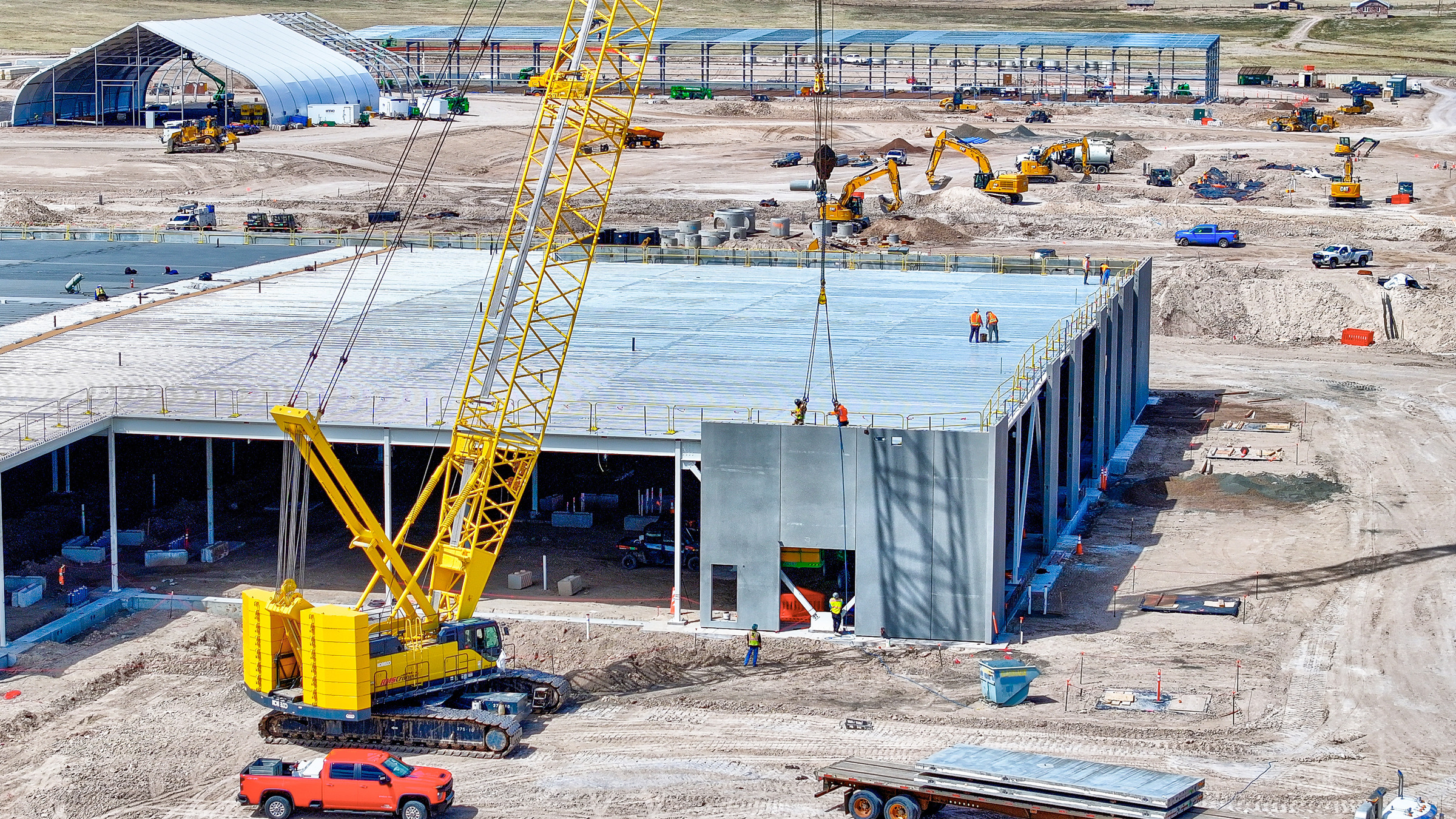 Prefabricated construction played a central role in streamlining delivery and meeting the demands of a high-performance environment. With close collaboration, Wells provided a fully prefabricated building envelope integrated with a steel frame. This approach enabled accelerated construction, long-term strength, and consistent standardization across the client’s other data centers. Through coordinated planning and efficient installation sequencing, the Wells team installed an average of 18 – 20 panels per day to quickly enclose the structures and keep the project on schedule.