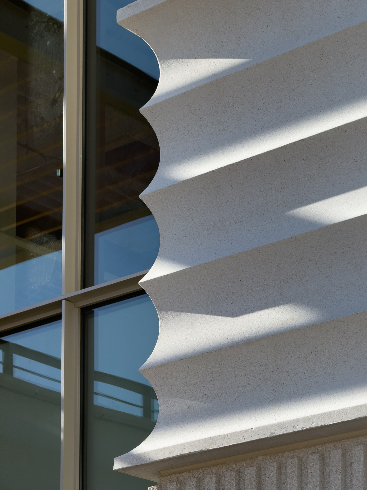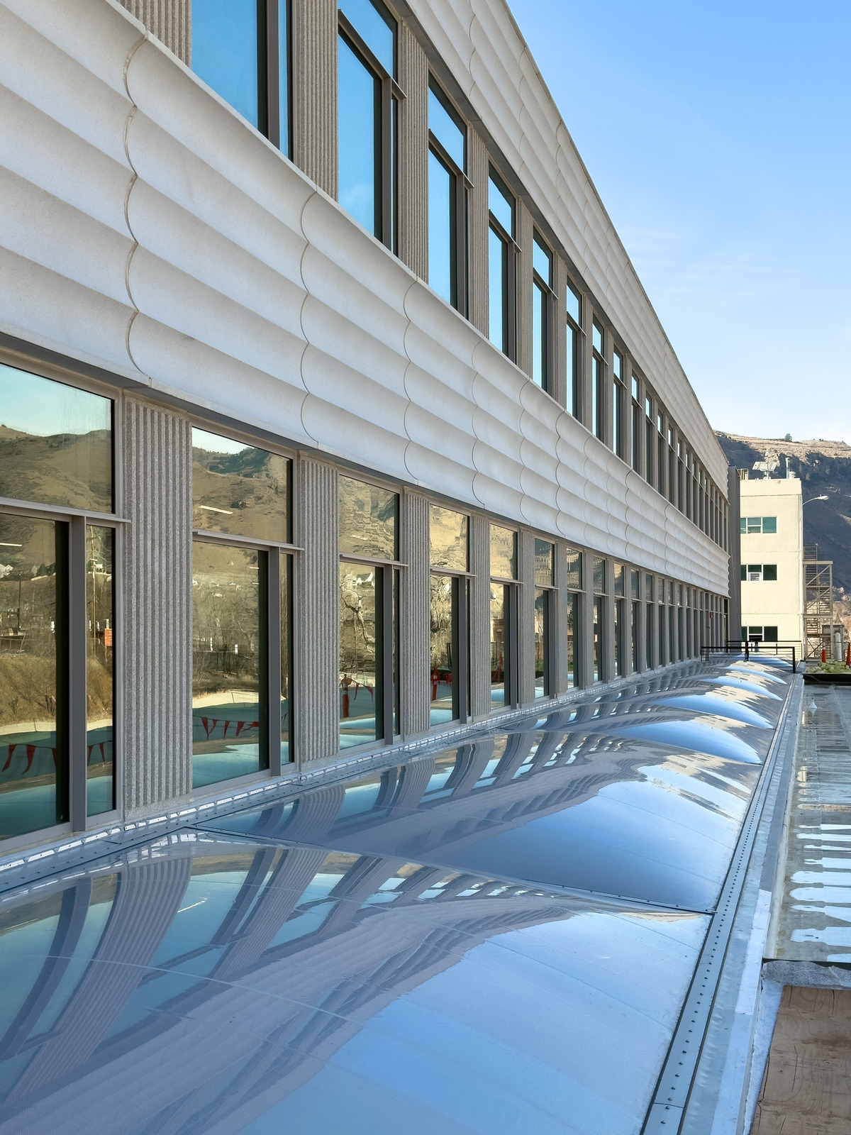 Given the weight limitations of the steel superstructure, the use of a lightweight unitized building envelope system was essential, providing the necessary performance without the weight of traditional precast. Each unitized panel — some as large as 36 feet wide and 15 feet tall — was carefully designed to meet both aesthetic and structural demands. A CNC machine was used to create custom formwork for the large, intricate designs, ensuring the flexibility to meet the project’s design requirements. The building’s exterior features distinctive acid-etched scalloped details and exposed aggregate vertical flutes, creating a dynamic visual appearance.