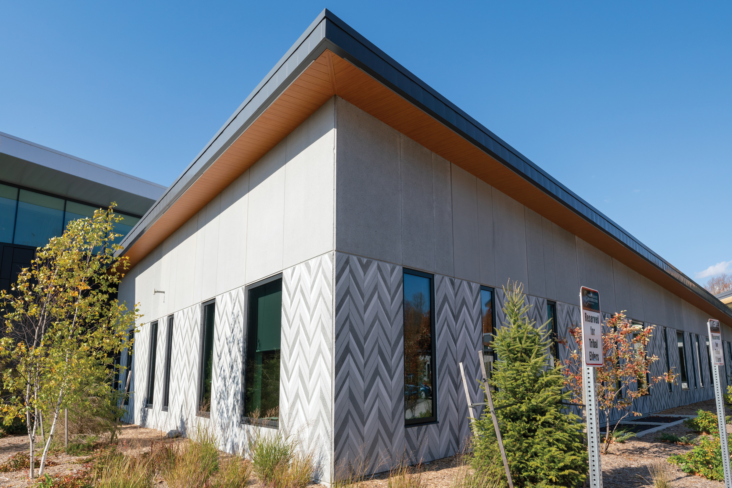 The Forest County Potawatomi (FCP) community had a strong design vision and was an integral part of the process from the very beginning. Organized around a central hub with two wings extending outward, the facility takes the shape of an eagle in flight when viewed from above — a sacred symbol of the FCP. Wells supported the vision through prefabricated building solutions, including exterior wall panels featuring a custom Graphic Concrete™ imprint that evokes feathered textures. The result is a durable, high-performing community center that honors cultural heritage and will serve the FCP people for generations to come.