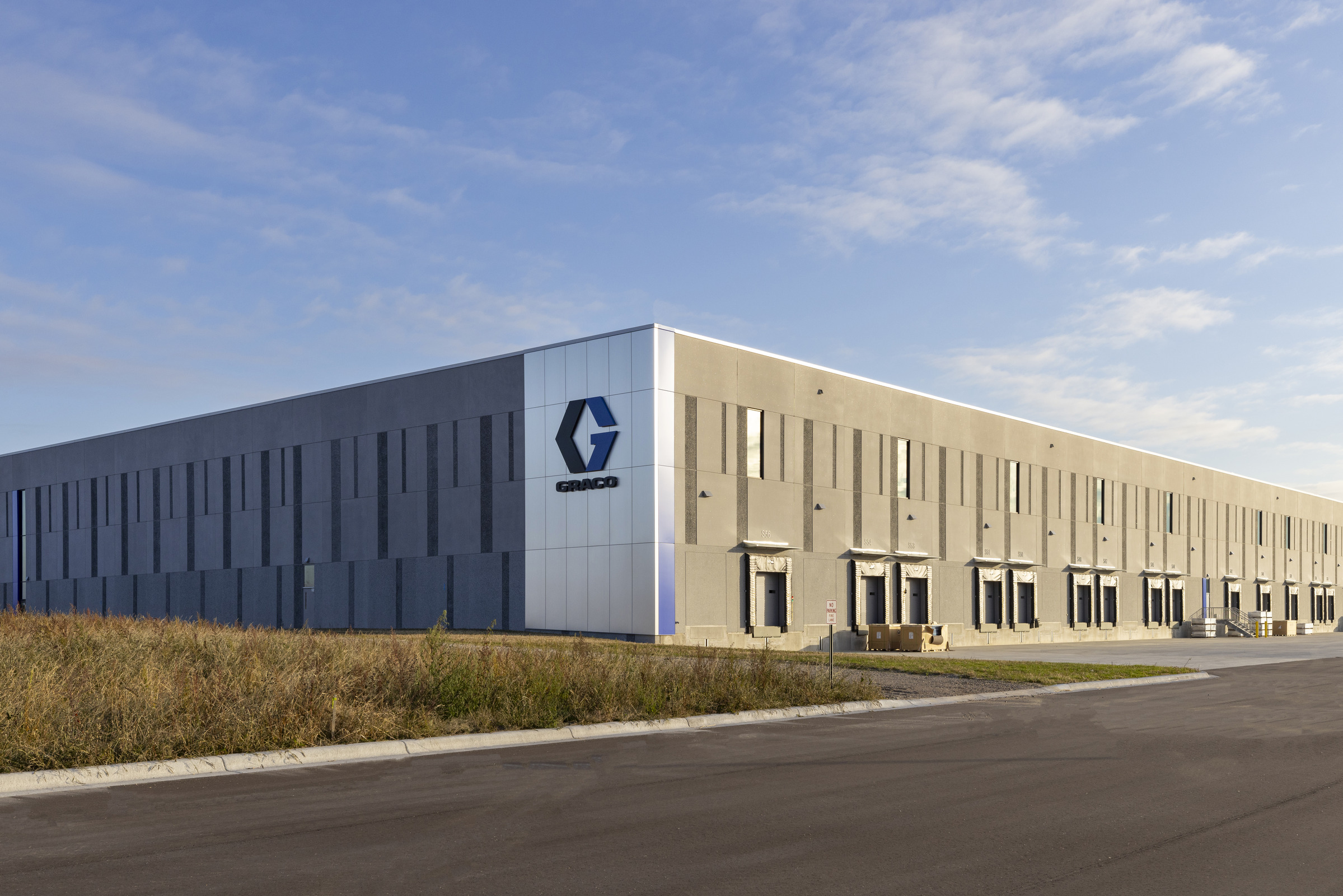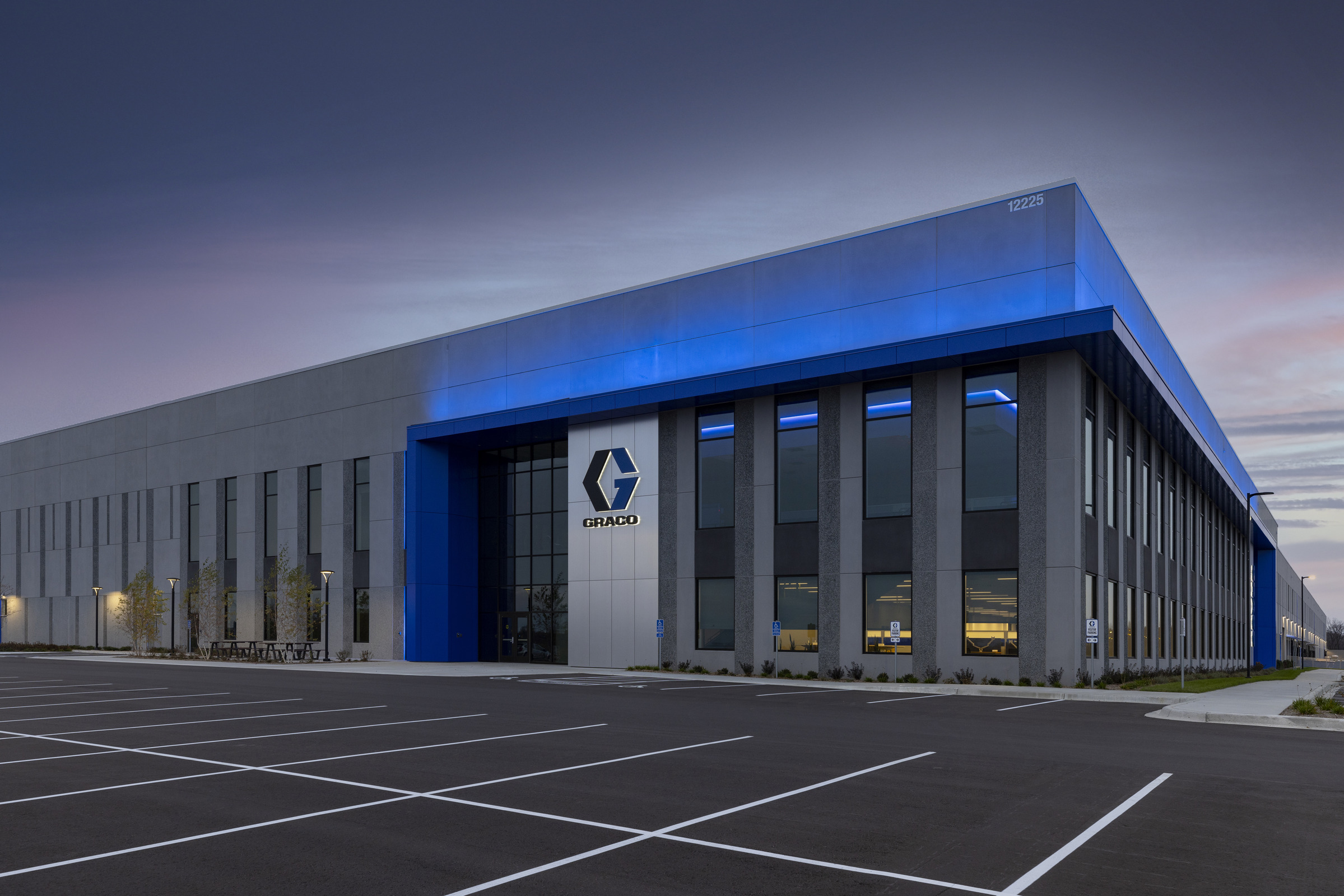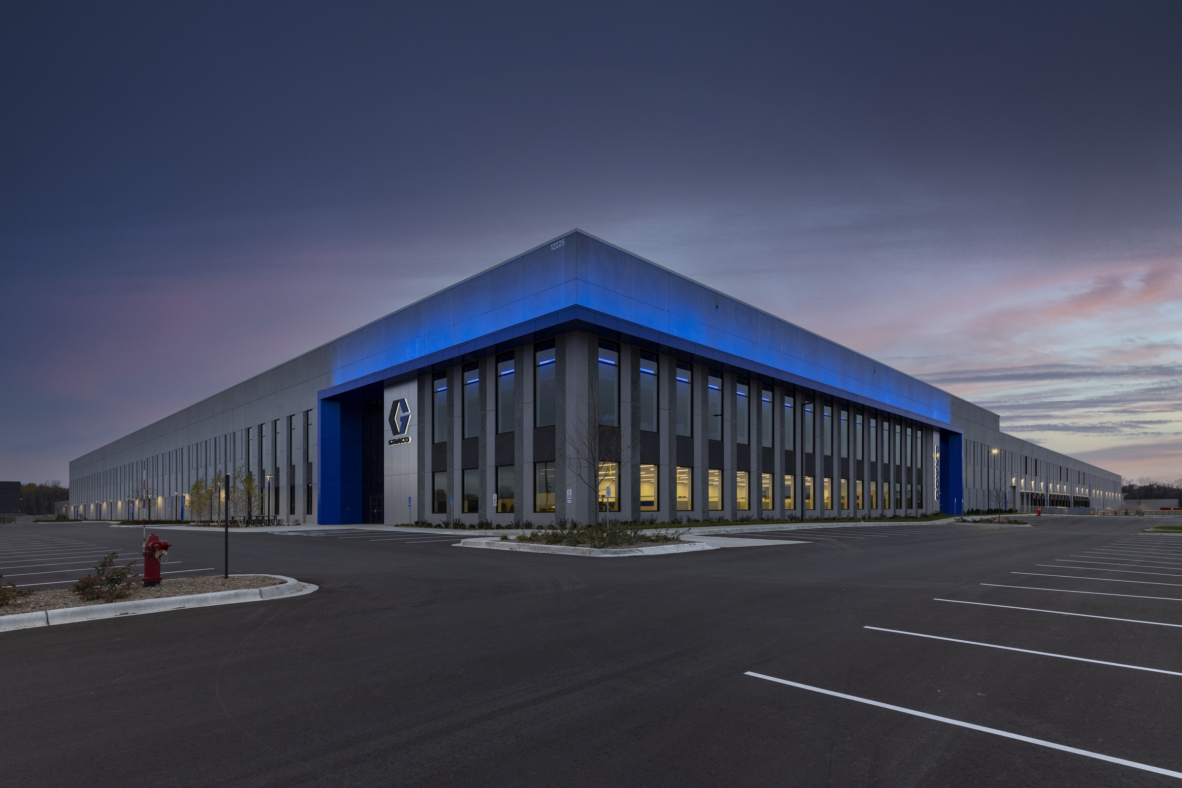 Graco, a Minnesota-based fluid-handling manufacturer, has been experiencing rapid growth in recent years, requiring more space for its manufacturing and distribution services. Phase one of the expansion in their French Lake campus in Dayton, MN, included a 538,000 sq ft manufacturing facility and office. Phase two was the creation of Graco Distribution Center, a 530,000 sq ft warehouse with a 30,000 sq ft office area. The Graco Distribution Center embodies a meticulous blend of functionality and aesthetic appeal, strategically designed to accommodate the company's operational needs with a striking building that prominently portrays the Graco brand, with dynamic accented blue lighting at night.