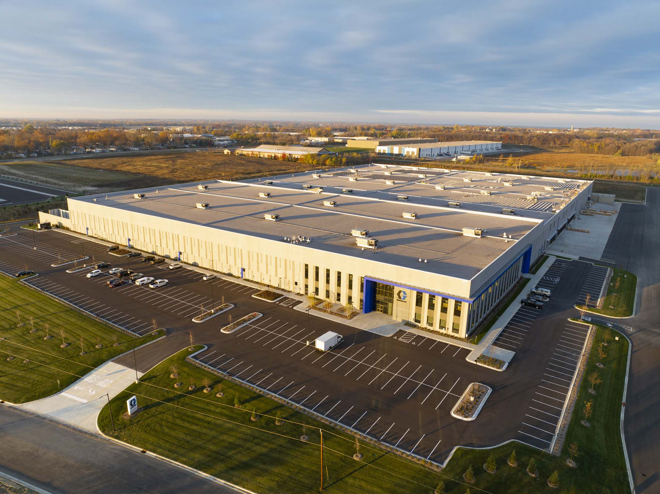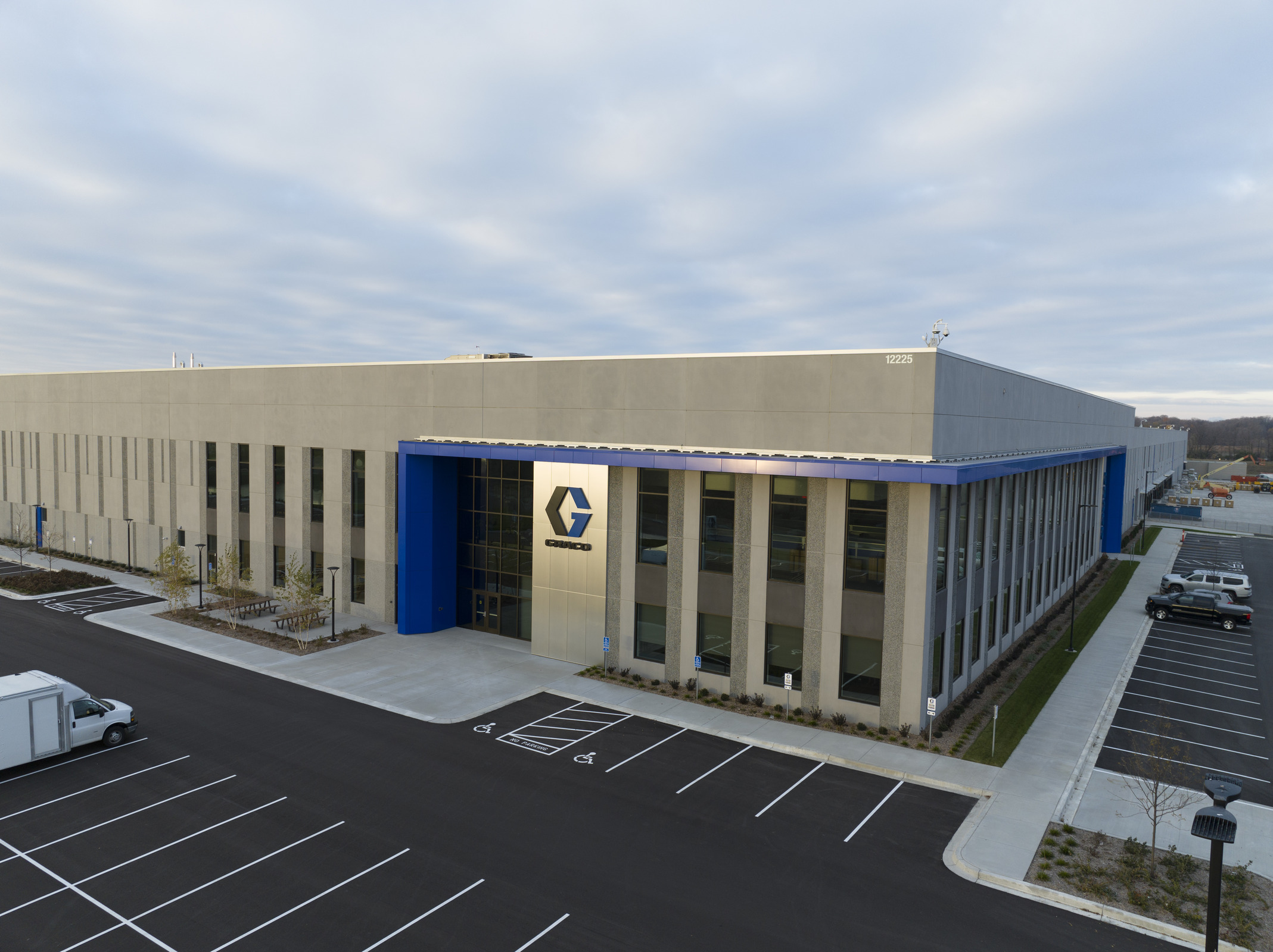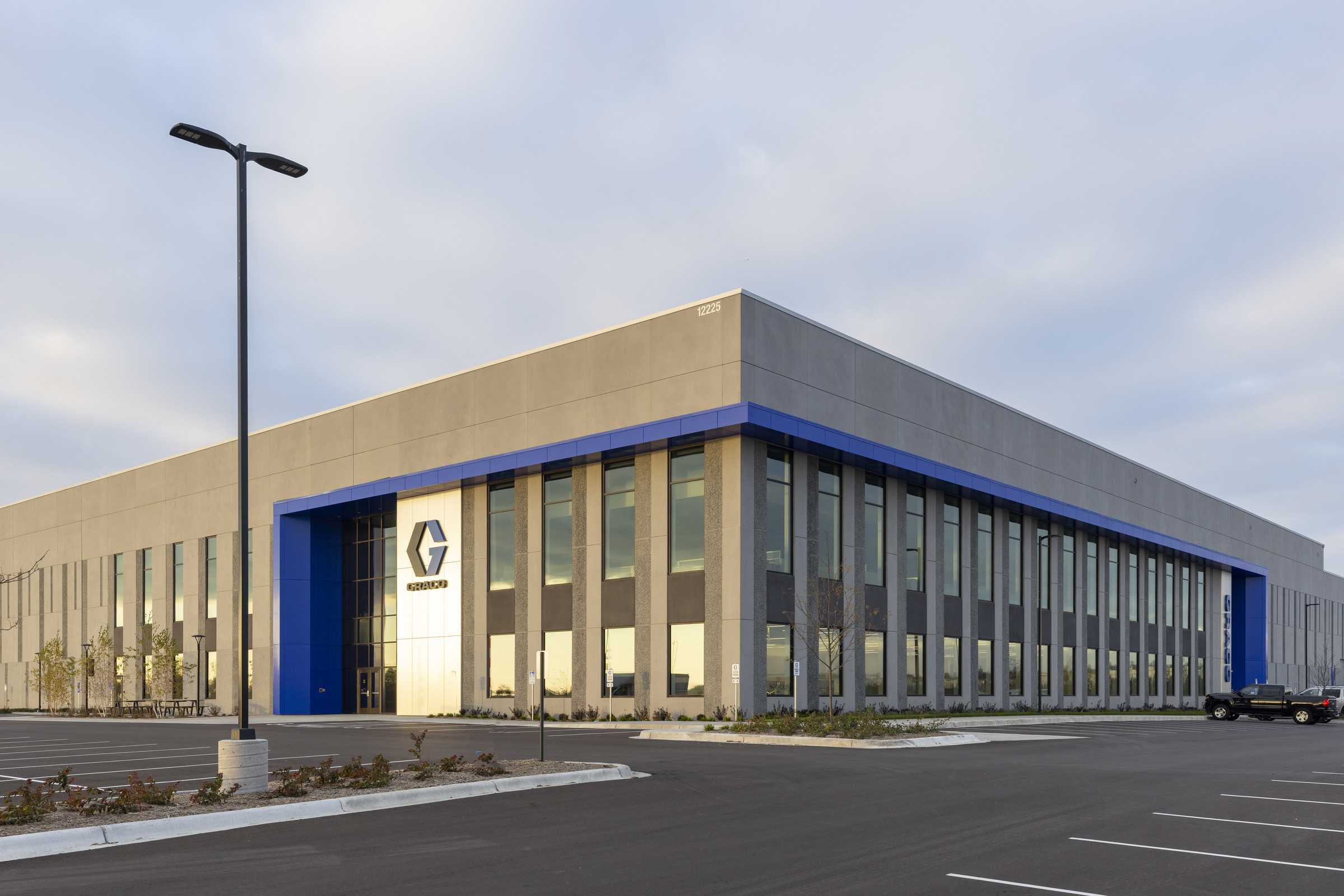 Graco, a Minnesota-based fluid-handling manufacturer, has been experiencing rapid growth in recent years, requiring more space for its manufacturing and distribution services. Phase one of the expansion in their French Lake campus in Dayton, MN, included a 538,000 sq ft manufacturing facility and office. Phase two was the creation of Graco Distribution Center, a 530,000 sq ft warehouse with a 30,000 sq ft office area. The Graco Distribution Center embodies a meticulous blend of functionality and aesthetic appeal, strategically designed to accommodate the company's operational needs with a striking building that prominently portrays the Graco brand, with dynamic accented blue lighting at night.