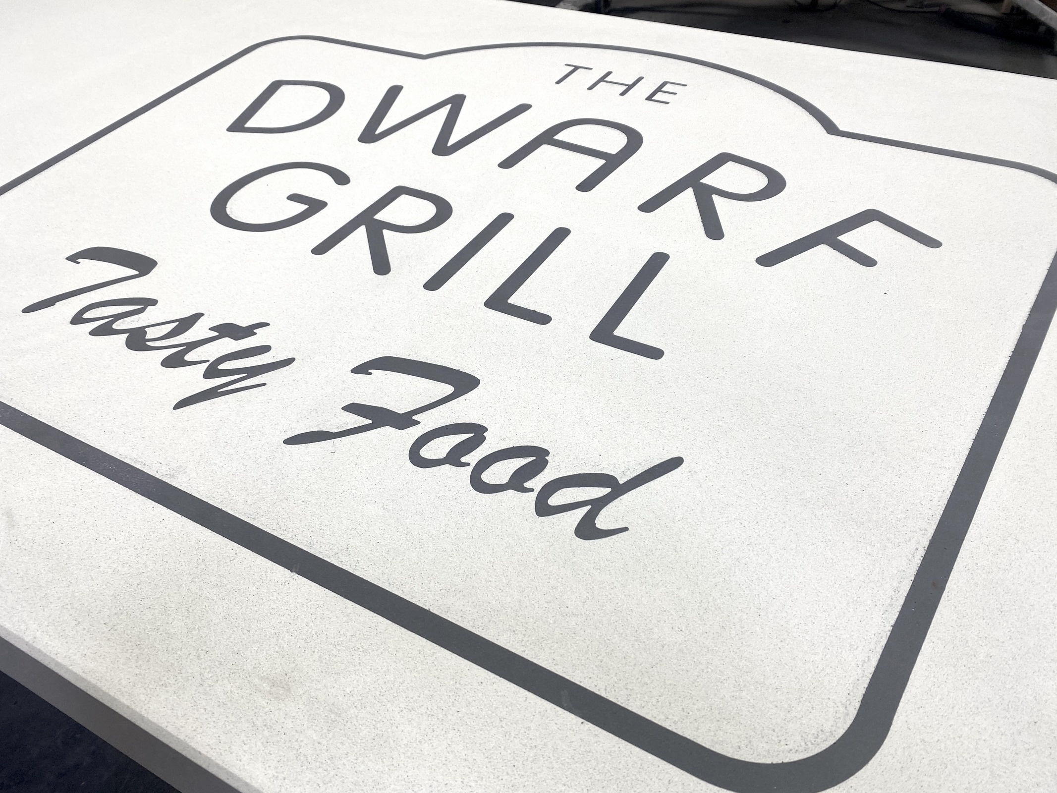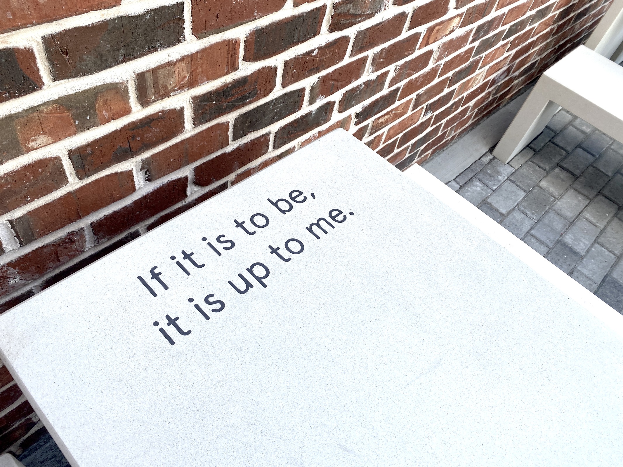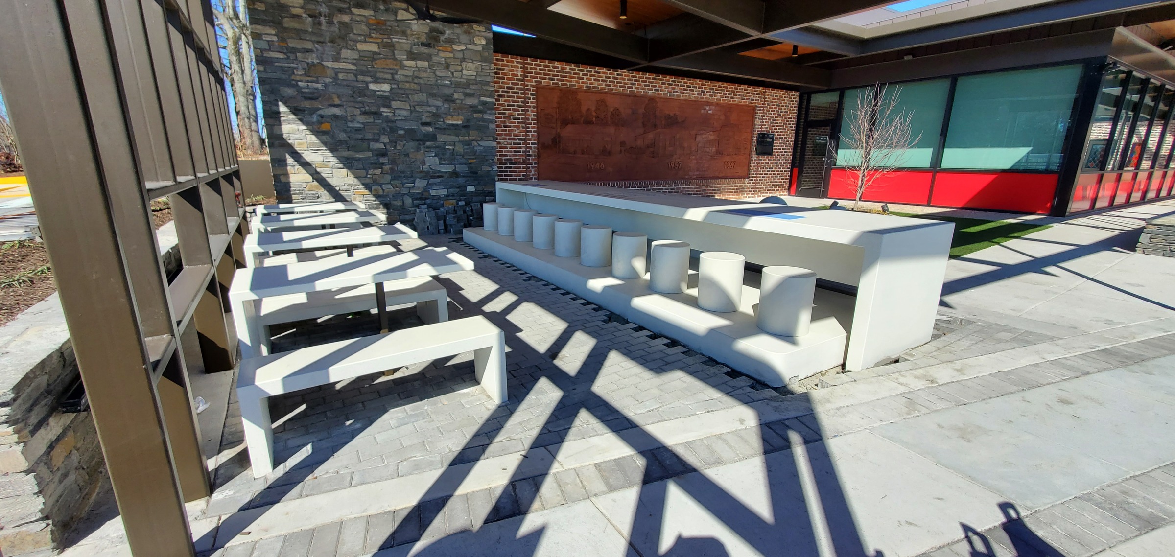 Wells crafted multiple pieces of exterior furniture for the project, including a 22-foot-long communal table cast as a single 4,000-pound unit with integral legs and a modesty panel that also serves as a structural support beam, along with cantilevered tables and matching benches designed for exterior guest dining. The scope also included furnishings for the employee dining area, featuring inspirational quotes inlaid directly into the tabletop surfaces.
