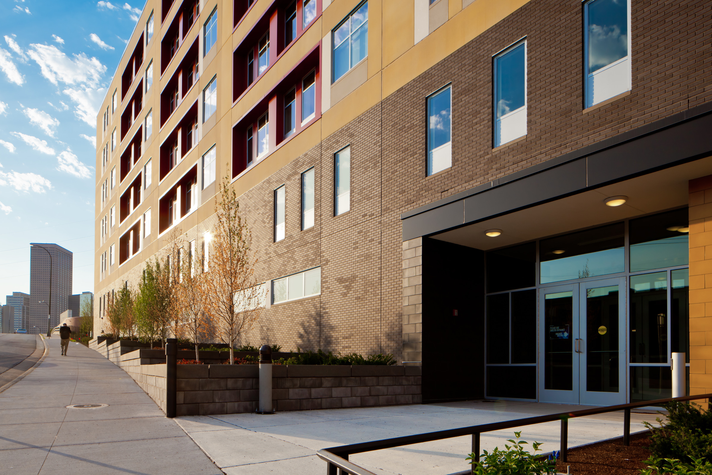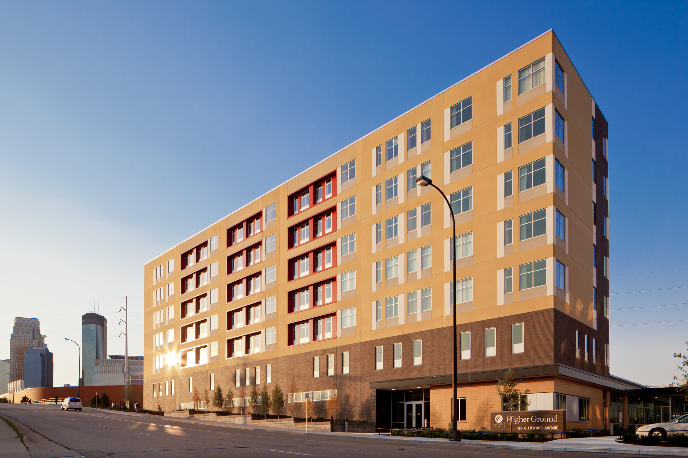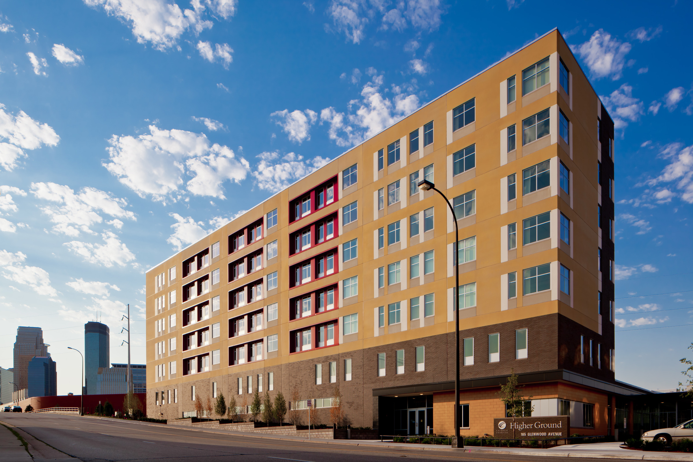 The Higher Ground homeless shelter brings both structure and beauty to the Minneapolis skyline, providing the groundwork for a community that everyone can be proud of. The first of its kind in Minnesota, Higher Ground gives residents an opportunity to move out of homelessness by combining permanent housing and emergency shelter in one building. Focusing on upholding people’s dignity and working with them to become as self-sufficient as possible, Higher Ground also provides them access to resources, including job skills training, mental health support services, and on-site direct health support.