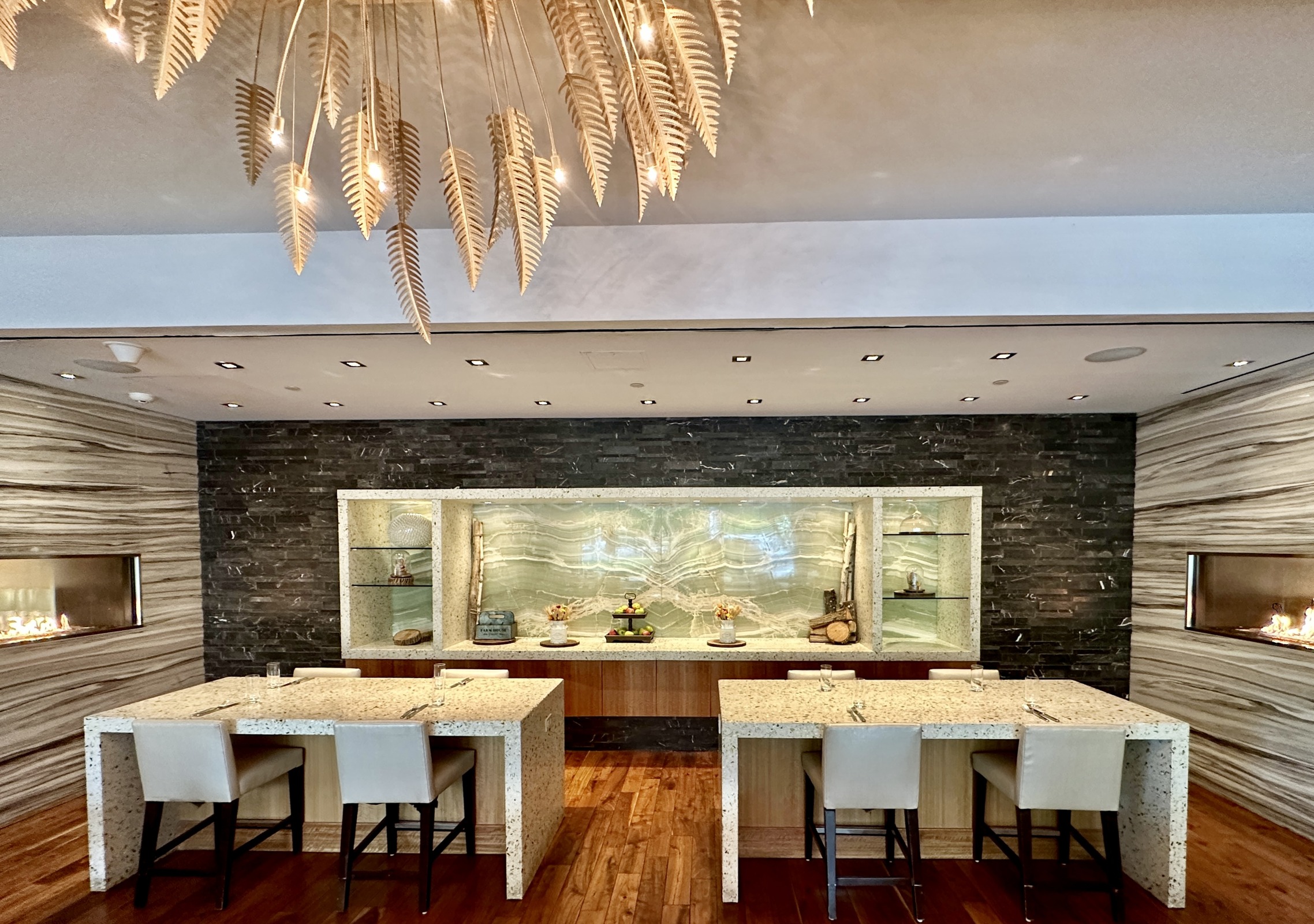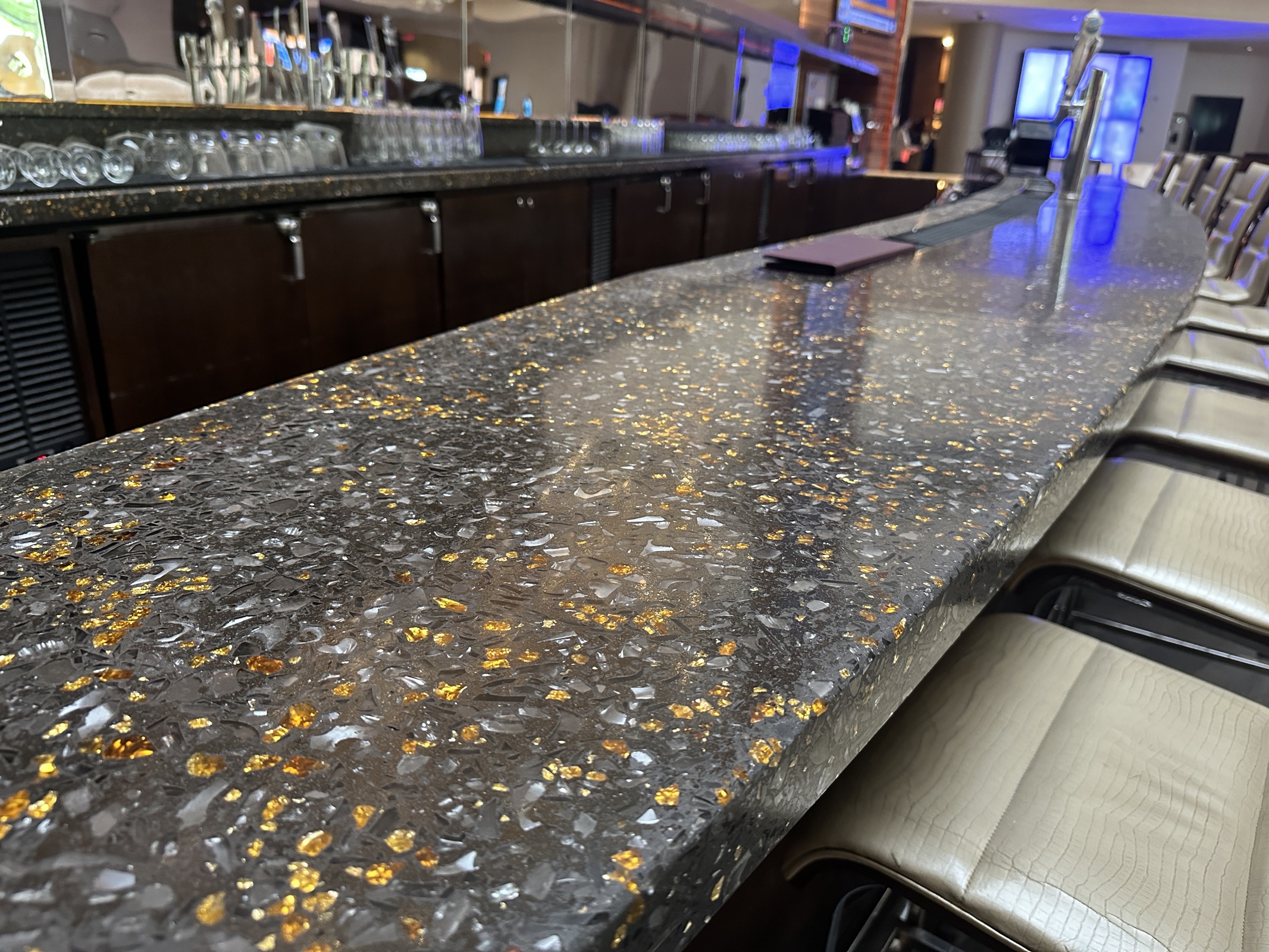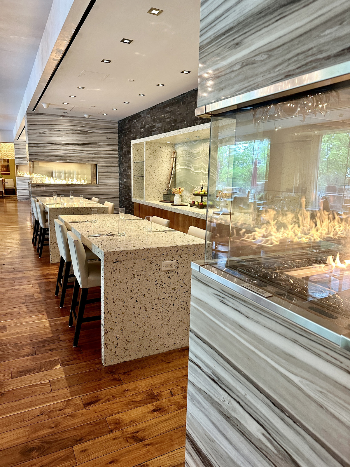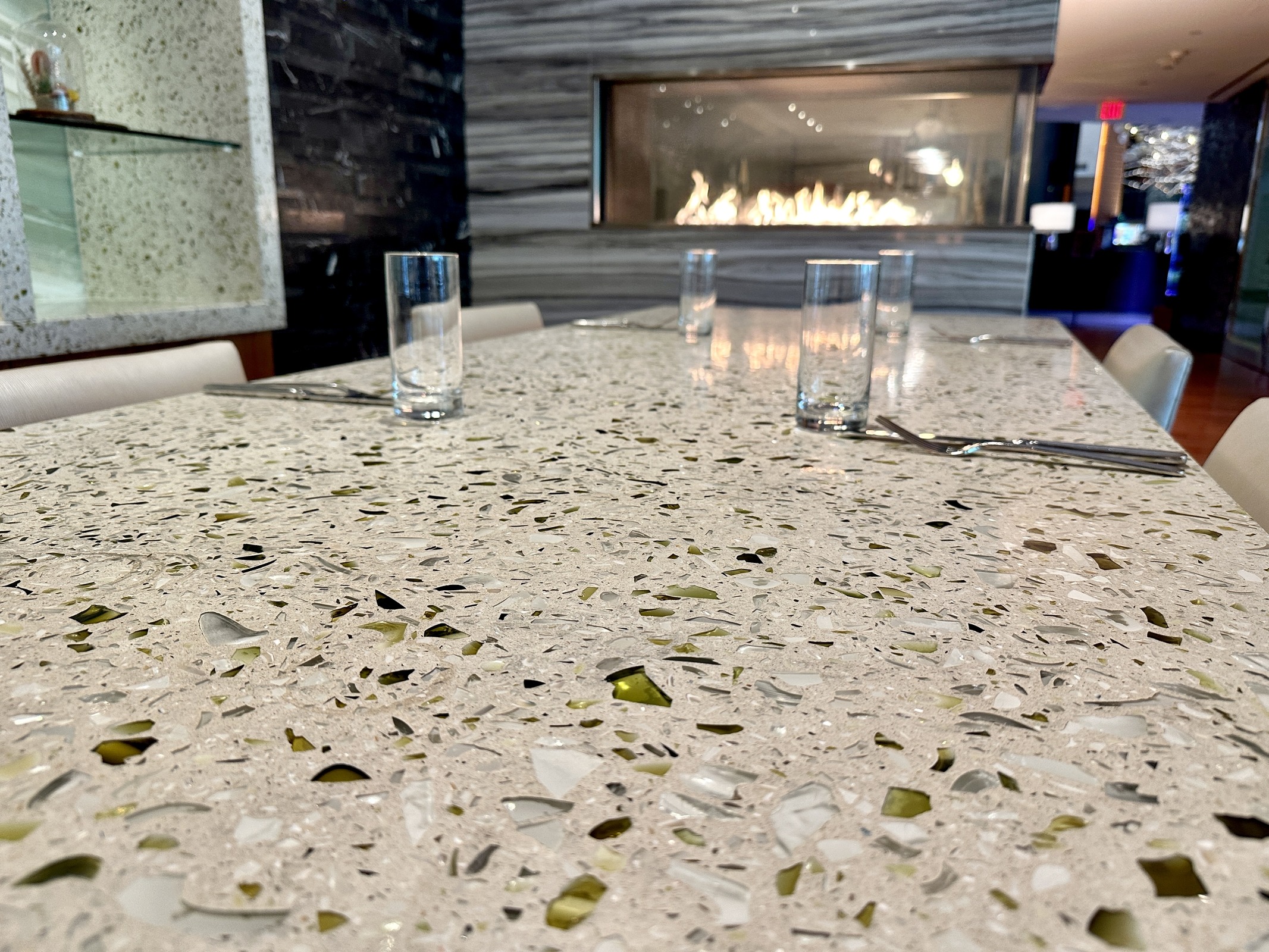 At Hilton’s flagship hotel in Tysons Corner — just minutes from the brand’s global headquarters — the architect reimagined the lobby and Hearth restaurant experience, and Wells assisted in bringing their vision to life with DEX. The signature curved day-to-night bar anchors the space, designed to transition seamlessly from morning coffee service to evening cocktails. Its DEXterra terrazzo bartop, embedded with crushed wine bottles and polished to capture the glow of overhead glass tube lighting, creates a luminous focal point that shifts with the rhythm of the day.