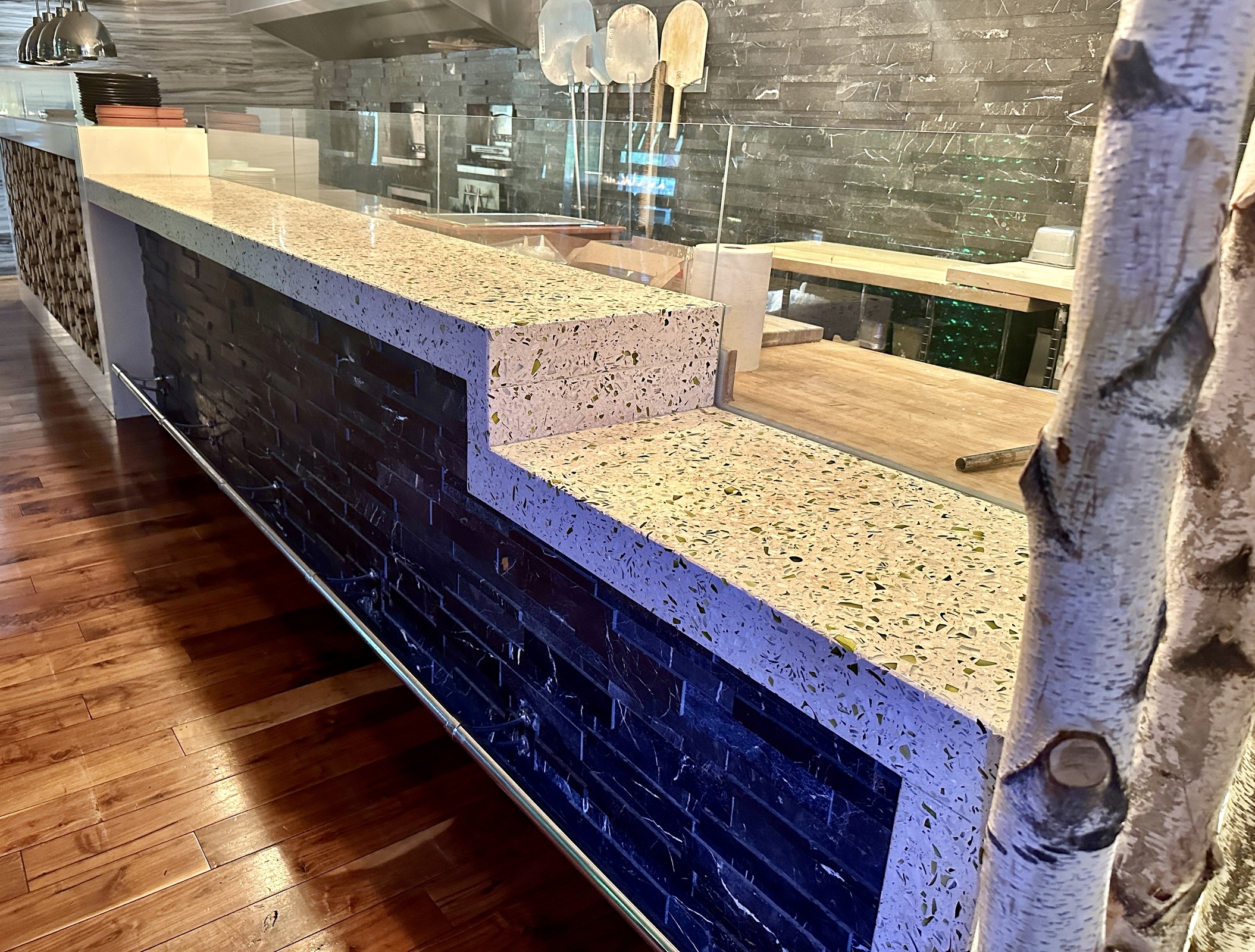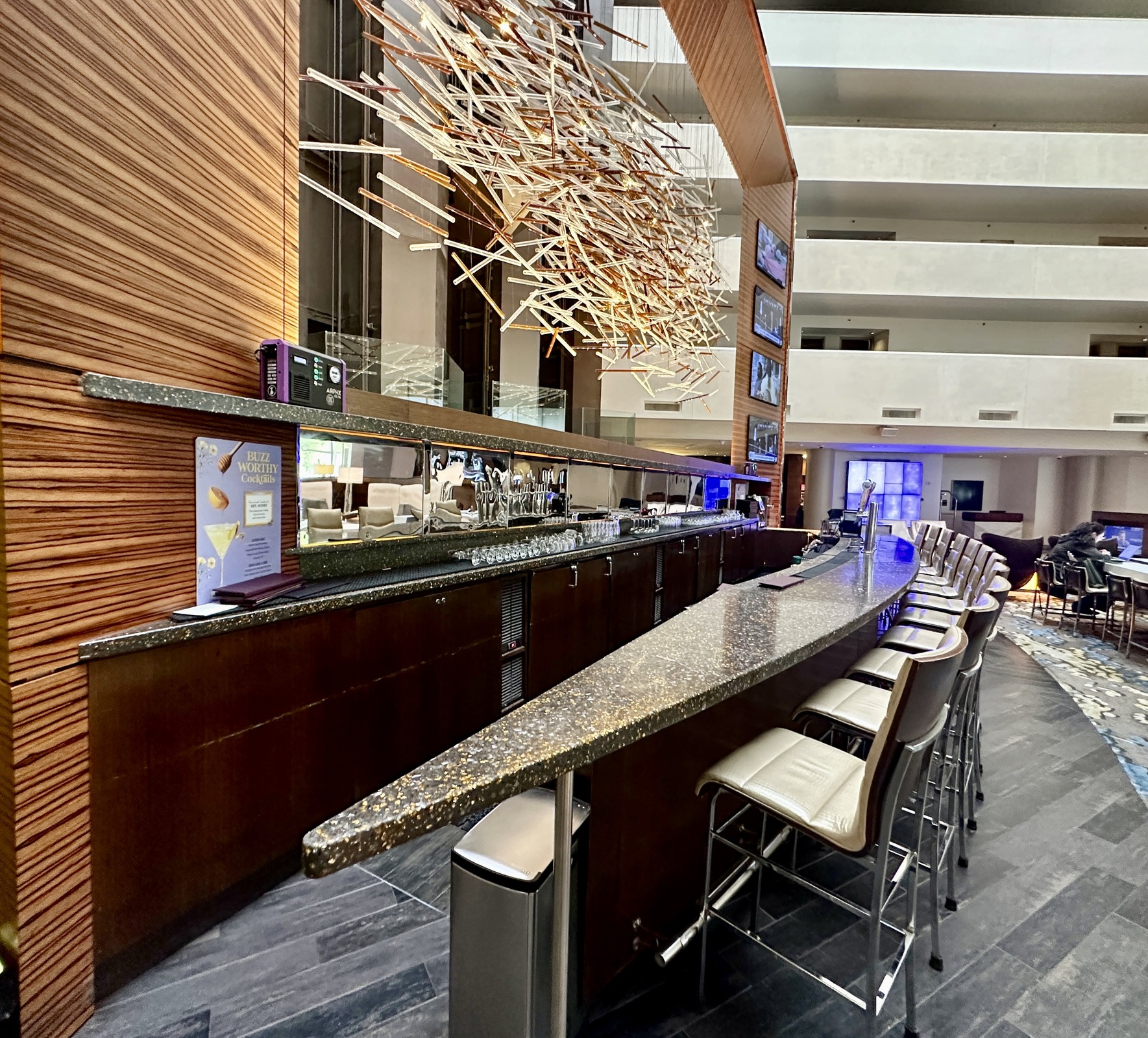 Wells' contributions extend throughout the lobby and restaurant, including the back bar, freestanding community dining tables, pizza oven counter, and a suspended server and display unit finished in DEXterra terrazzo with a natural stone back panel. Together, these high-performance terrazzo elements reflect Hilton’s modern hospitality brand while delivering the durability needed for a bustling flagship destination.