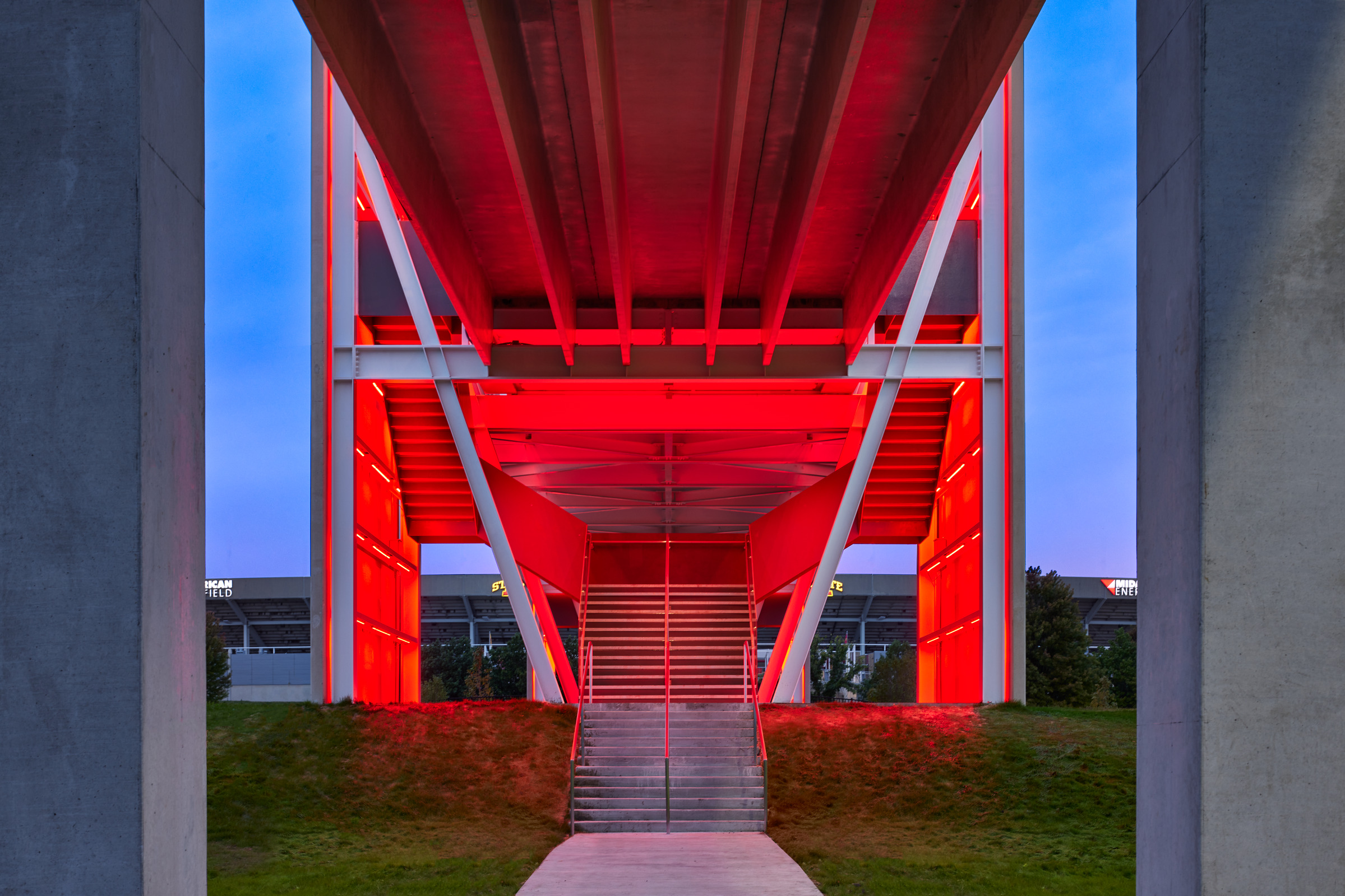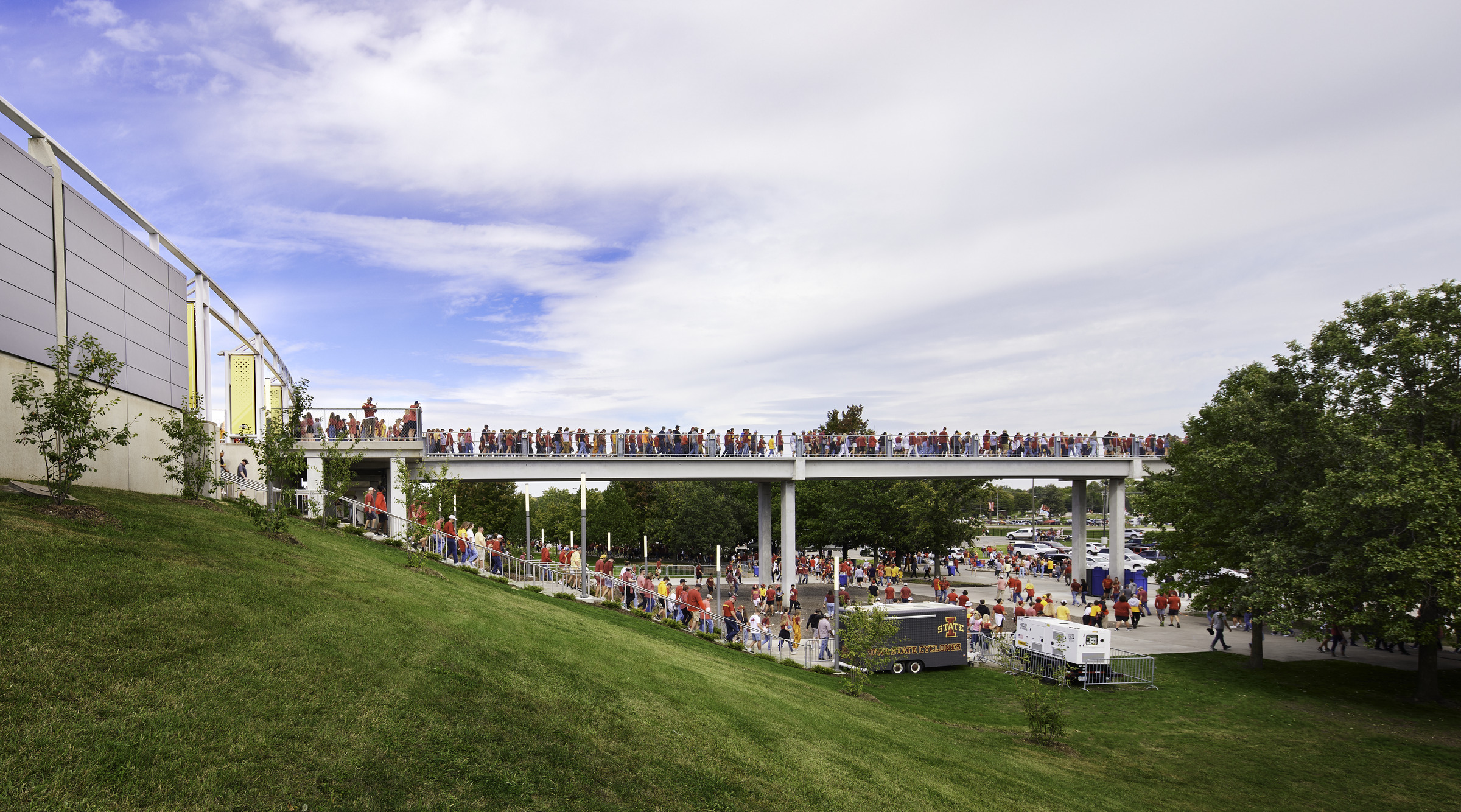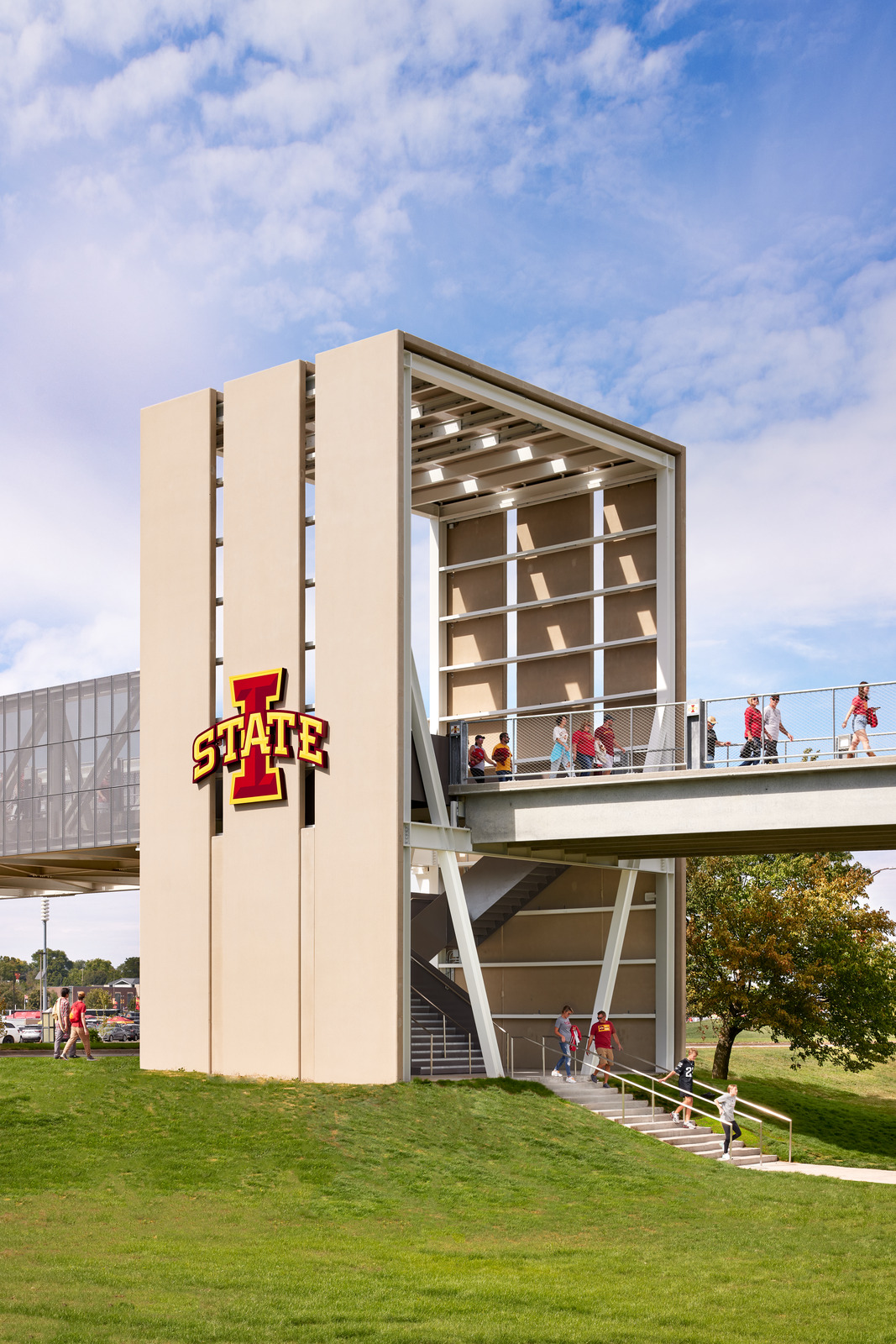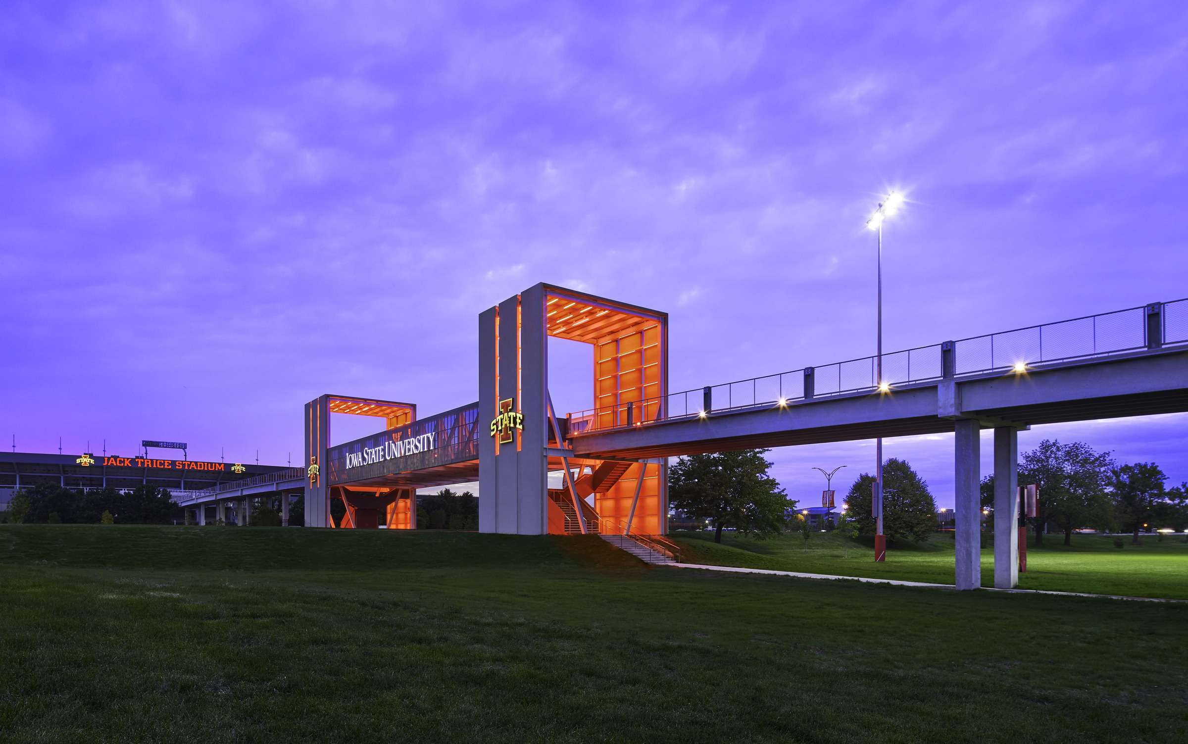 Bridge construction often presents unique challenges that demand innovative solutions. The ISU Jack Trice East Gateway Bridge serves as a remarkable testament to this, as its design exemplifies the harmonious integration of creativity and practicality. Iowa State University needed a large pedestrian bridge that spanned over a parking lot and a busy 4-lane street to allow fans safe access on game day from the new parking and tailgating lot into Jack Trice Stadium. From this need, the concept for an open-air pedestrian bridge with no roof, was conceived, a project that overcame construction challenges and ultimately yielded a bridge that is not only functional and secure, but also visually captivating and acts as a prominently visible entrance to the university campus. Made possible by two major donors, the bridge utilizes a prefabricated concrete system to create a stunning design — and a landmark that has received extremely positive reception from the community.