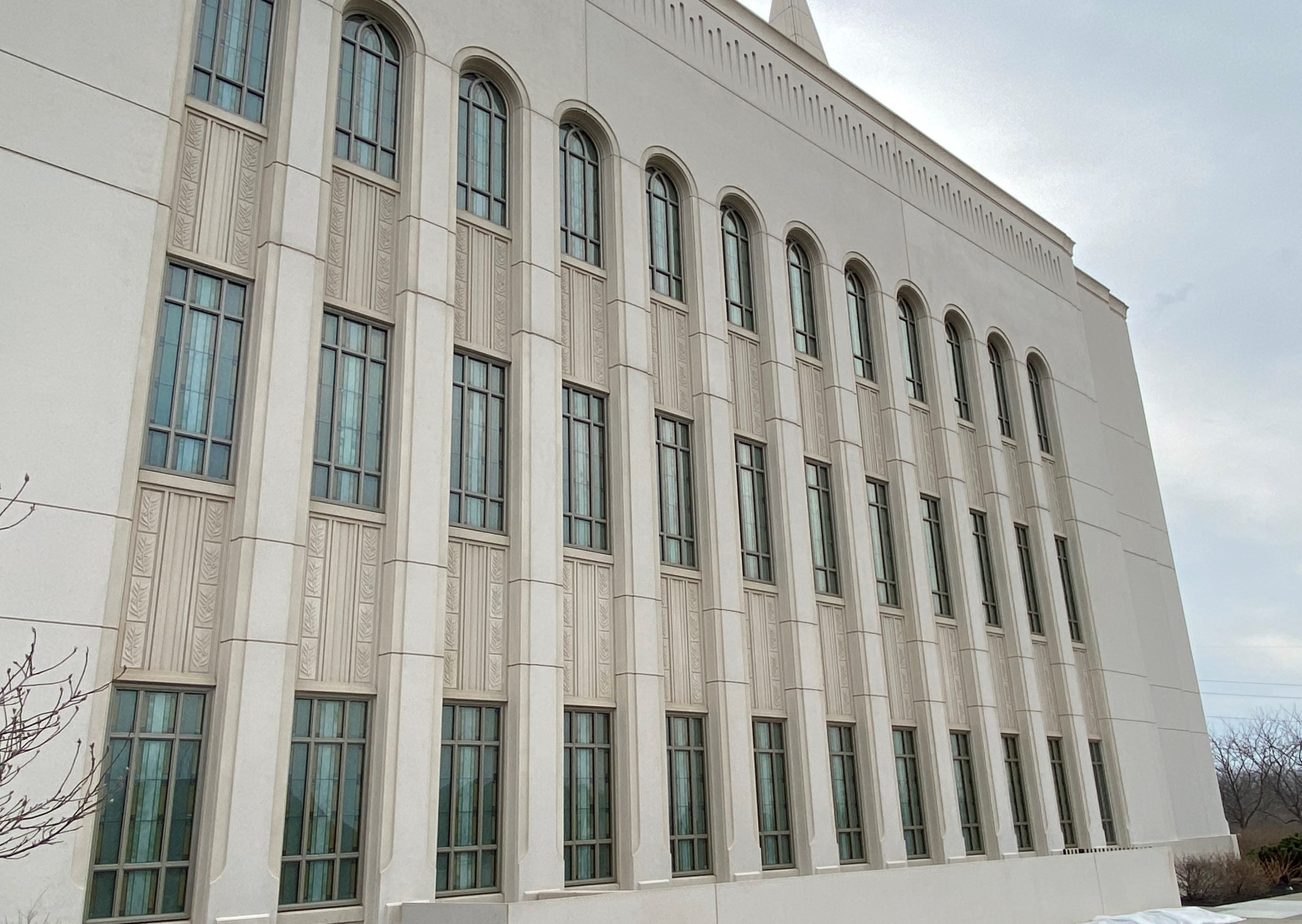 The facade of the three-story, 32,000 sq ft temple offers a distinctive presence, with a dual-spire design that rises more than 150 ft and creates a striking feature on the skyline. The prefabricated exterior was provided by Wells and features a simulated limestone, acid-etch finish that achieves the look and texture of natural stone, allowing the temple to resemble true masonry from a distance.