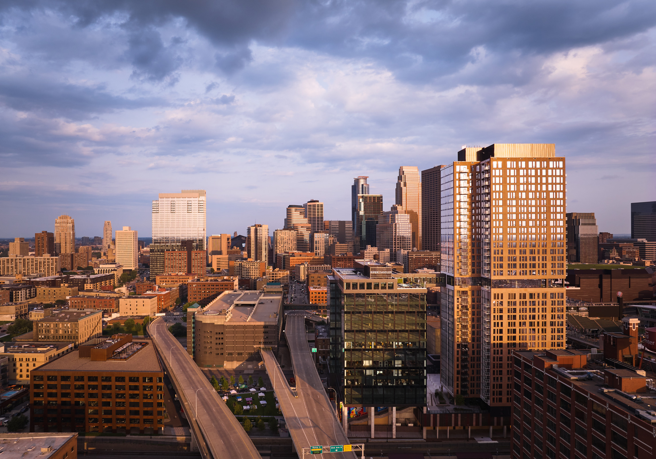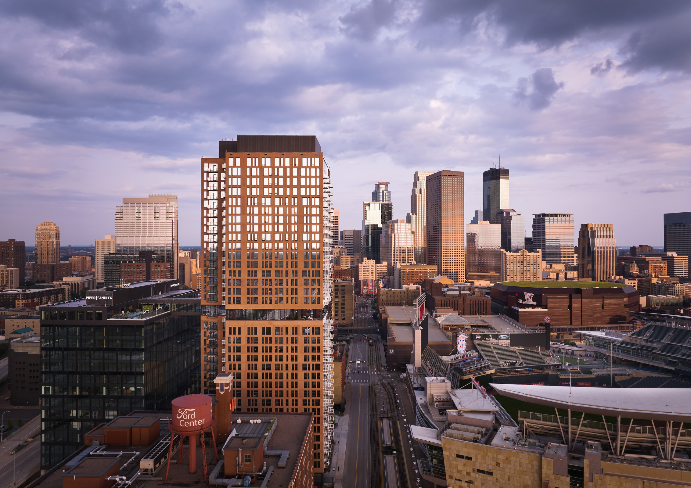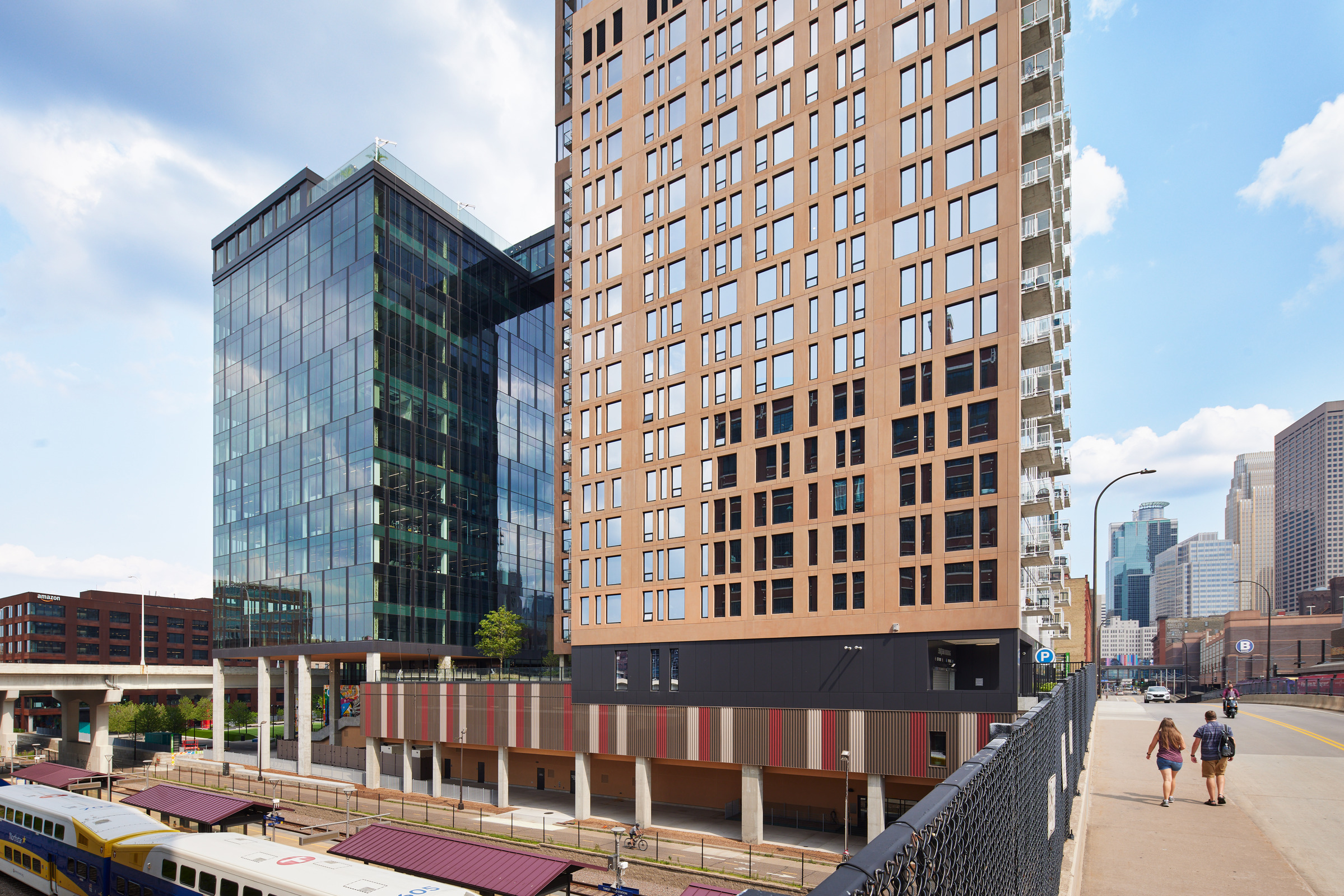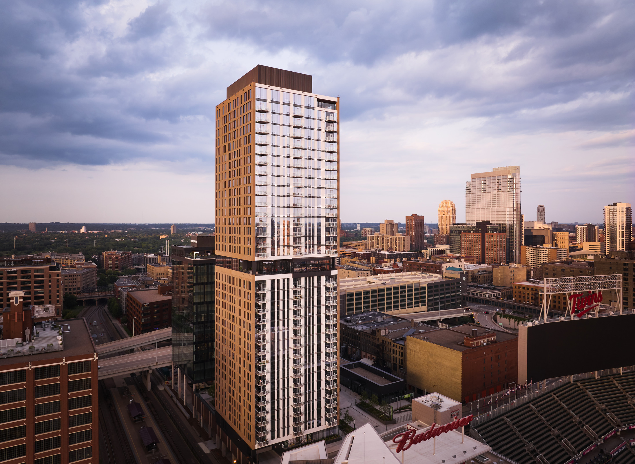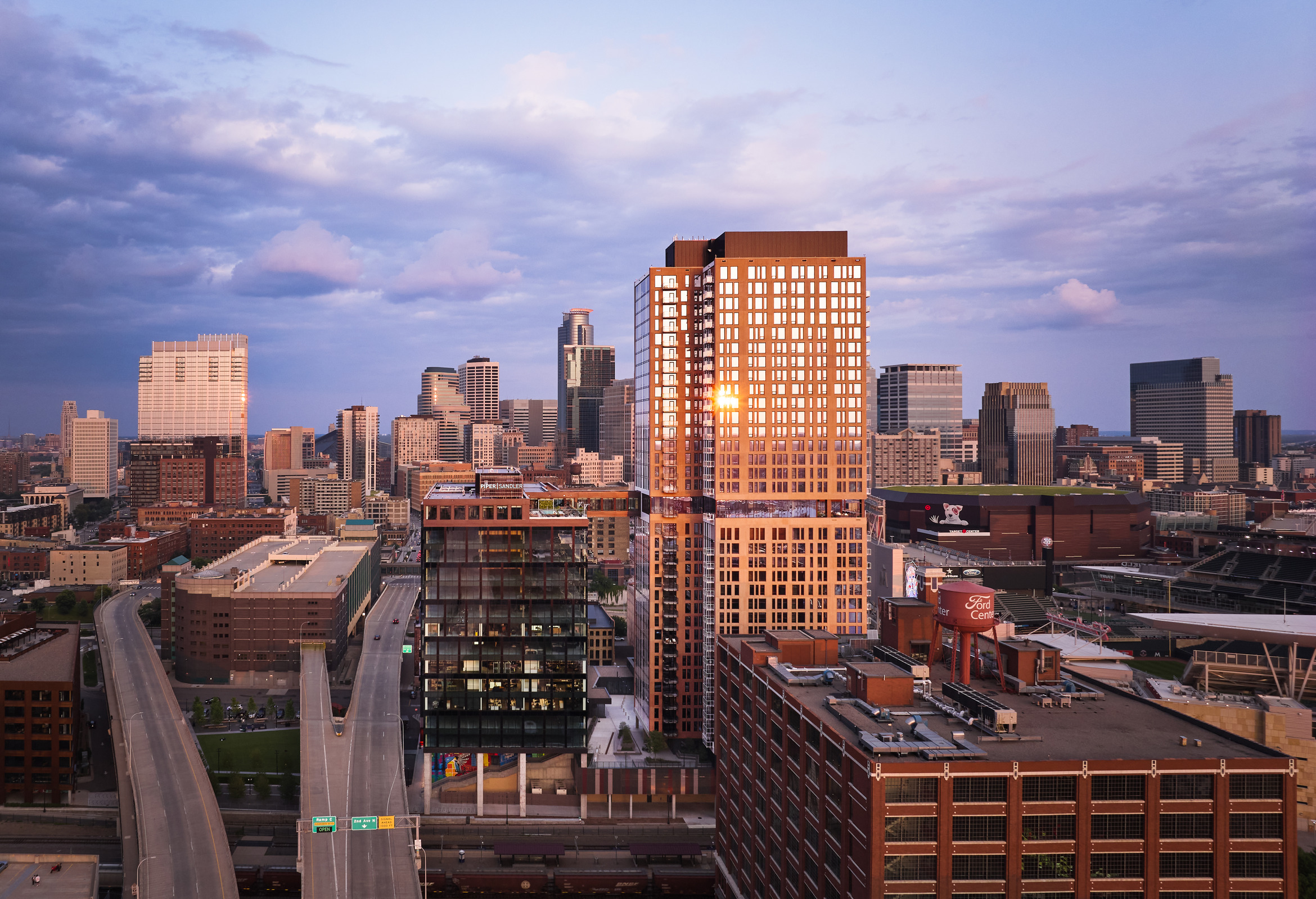 North Loop Green in Minneapolis, MN, is a 34-story multi-use building with 354 luxury rental units, 96 short-term rental units, 17,000 sq ft of ground-level retail and dining space, 14 stories of office space, underground parking, and a one-acre park – all directly across the street from Target Field. This structure adds to the already bustling area of North Loop, providing the neighborhood with a variety of desired urban luxury amenities and shared experiences.