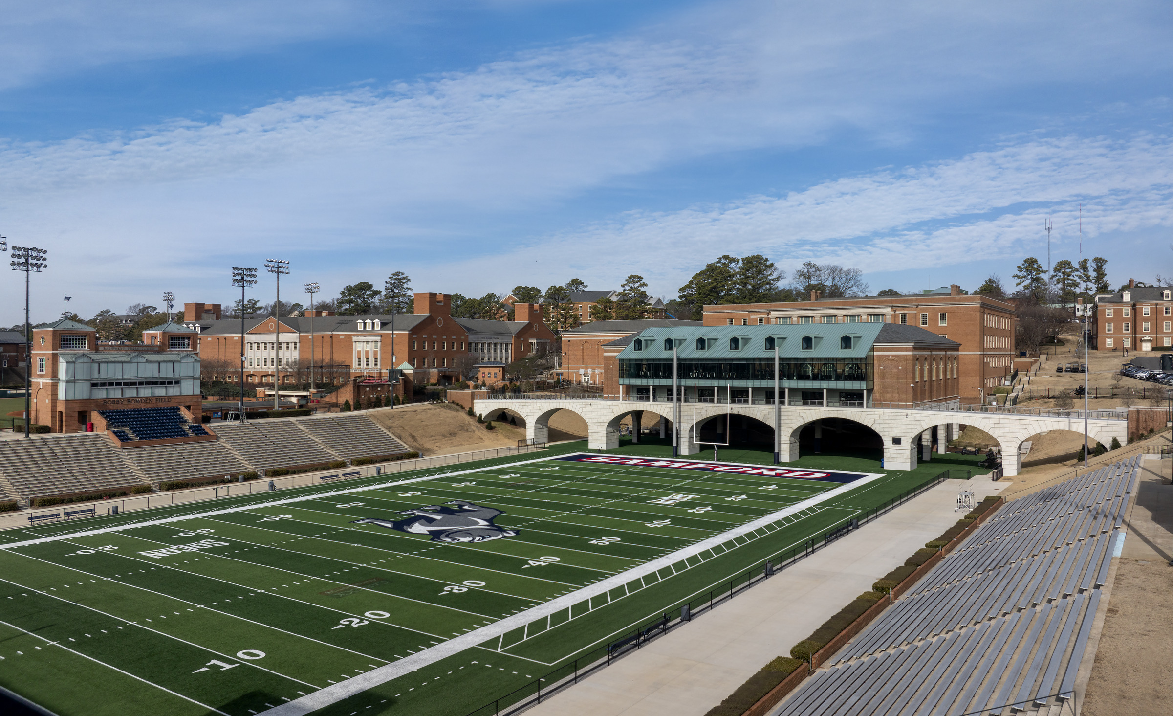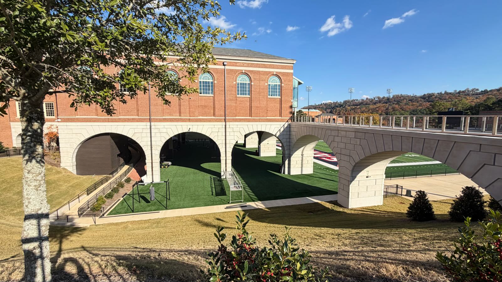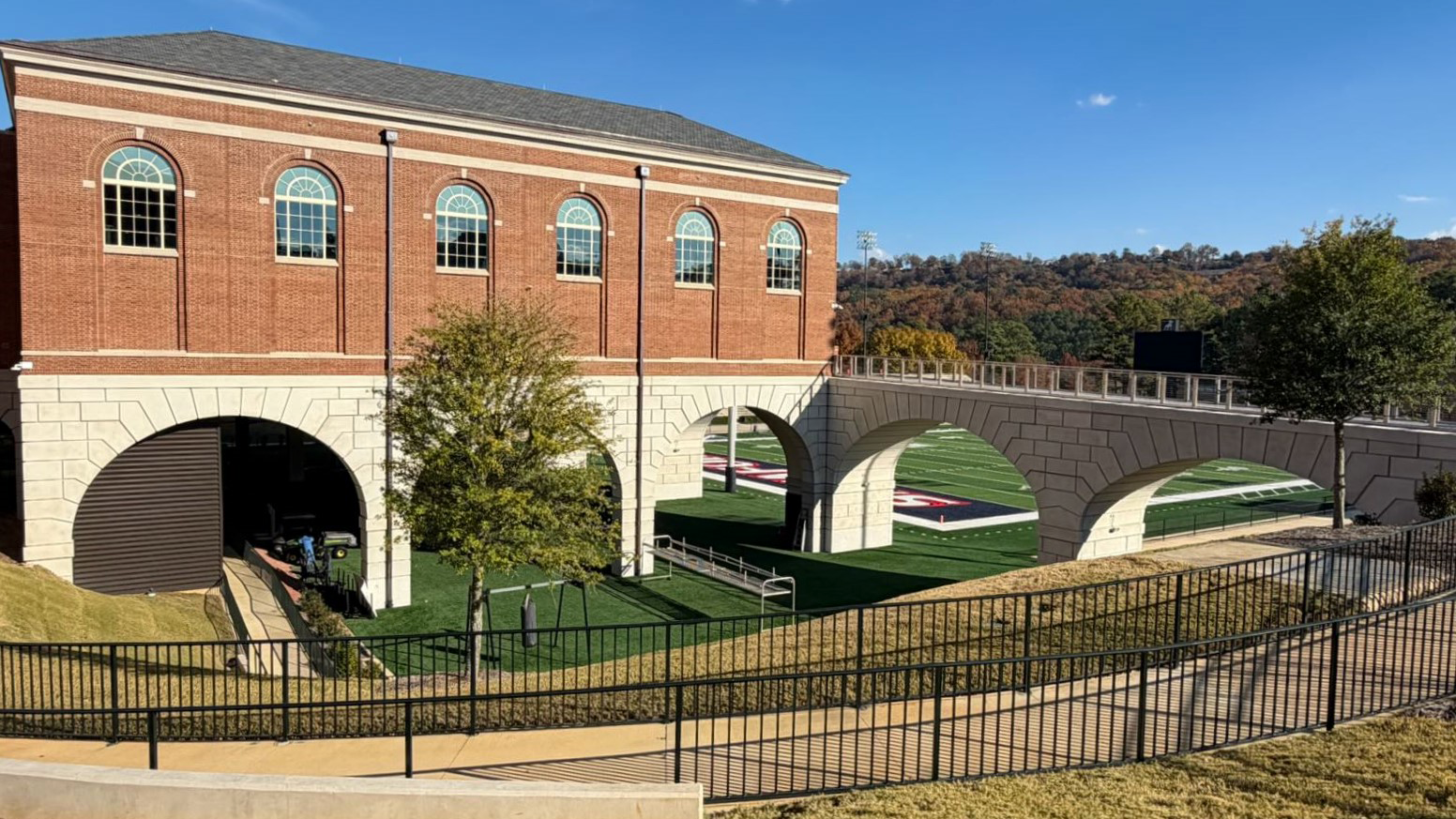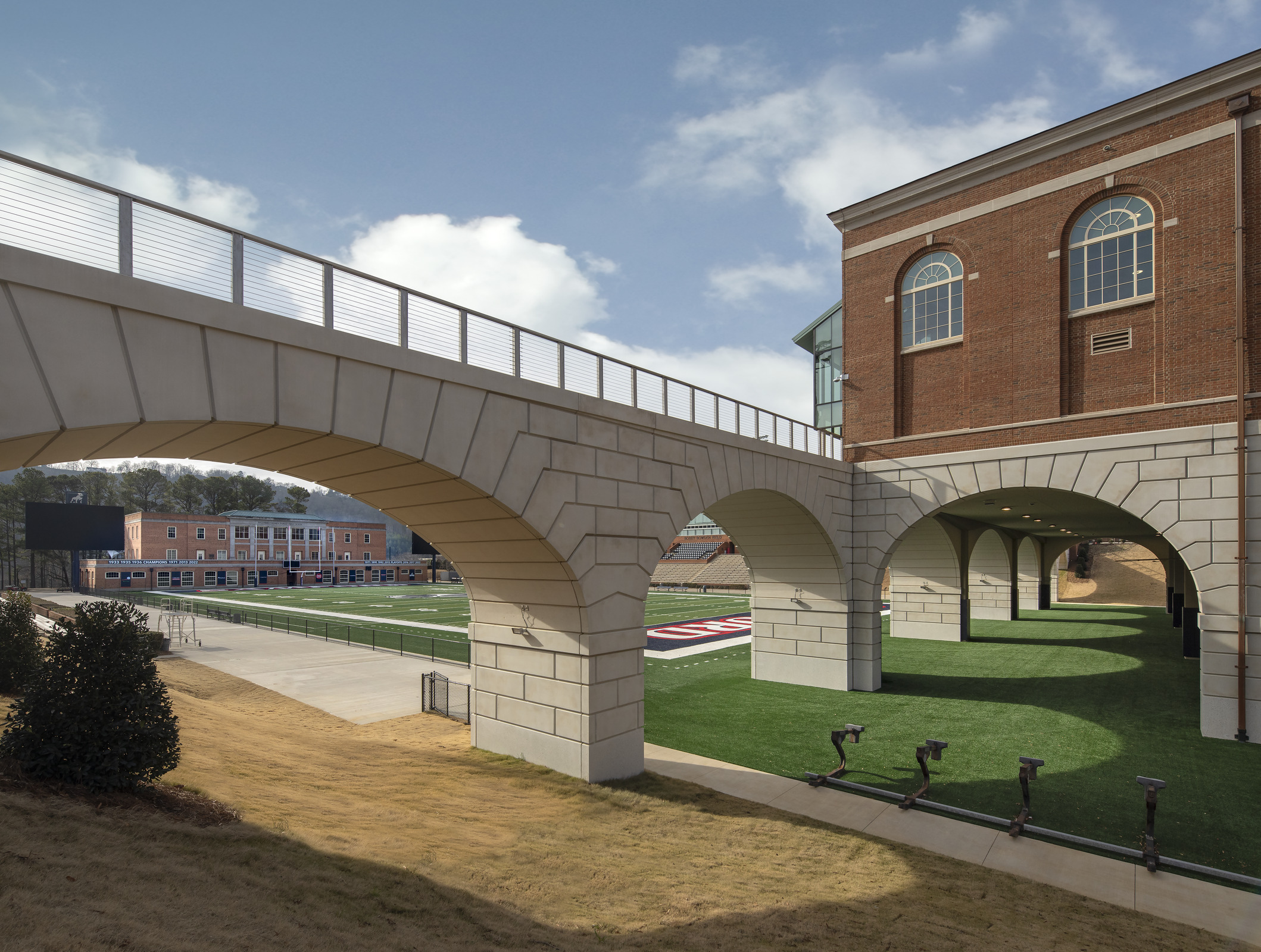 A defining architectural feature of the expansion is a pedestrian bridge spanning an active athletics field, connecting the recreation facility to the broader campus. Large prefabricated architectural panels form the multi-radius arches that support and frame the bridge, while coordinated vertical wall panels wrap the base of the new addition. Many of these panels interface directly with structural steel and cast-in-place concrete or are installed partially beneath the structure. Each element was detailed and installed with precision to maintain architectural continuity and deliver long-term durability in a high-traffic environment. Designed to echo the hand-laid limestone coursing found throughout campus, the precast components establish visual continuity and structural clarity, unifying new construction with historic surroundings.