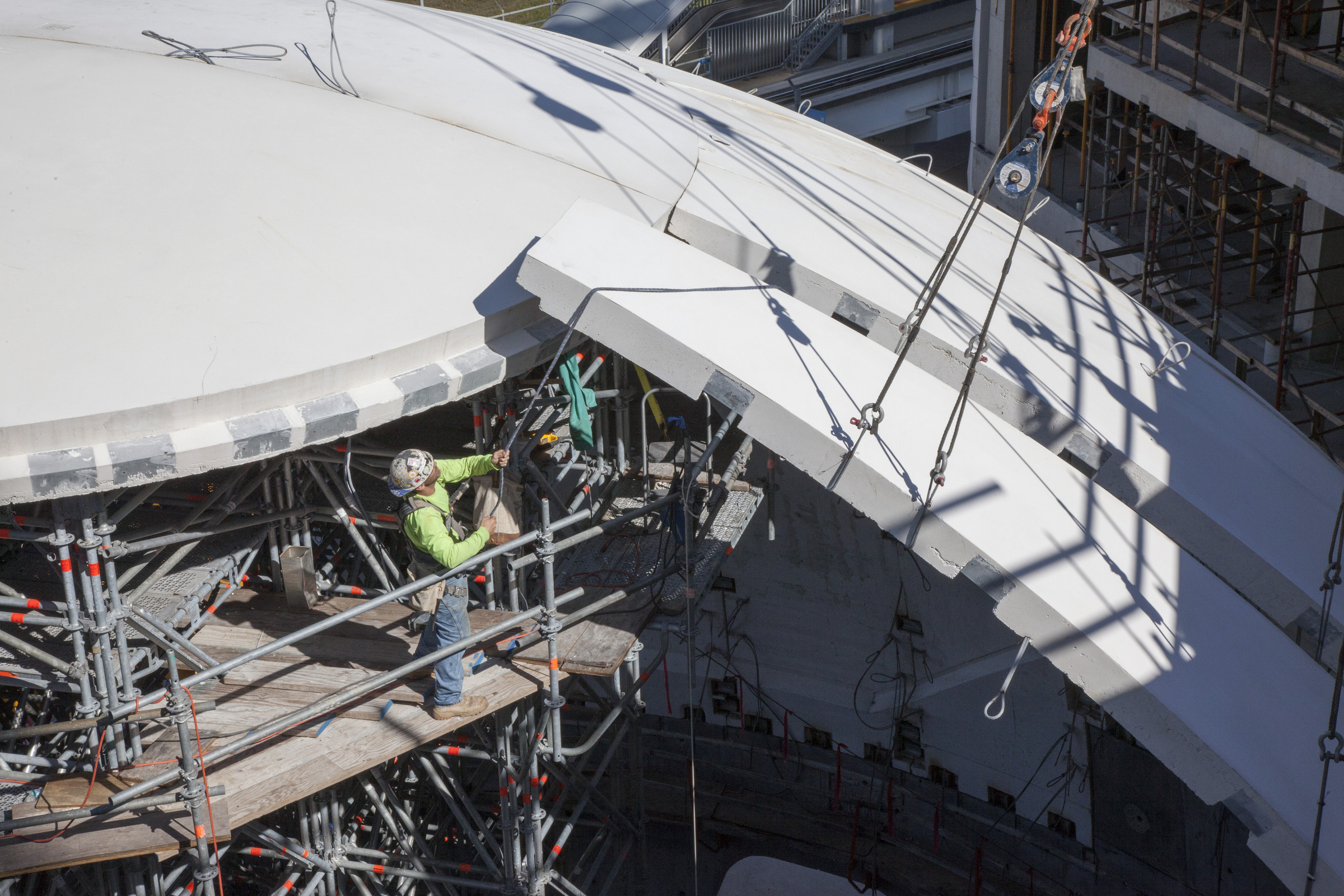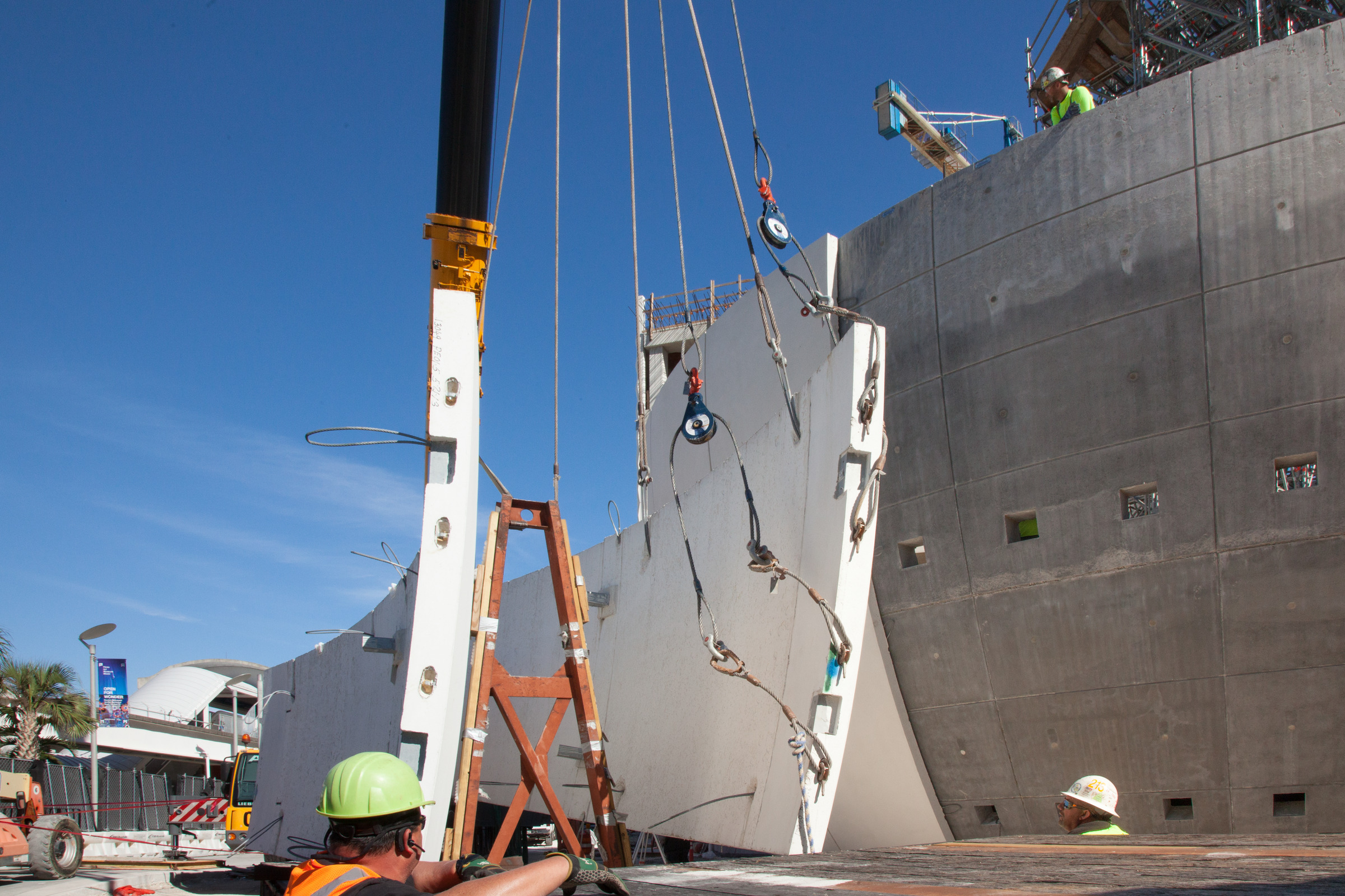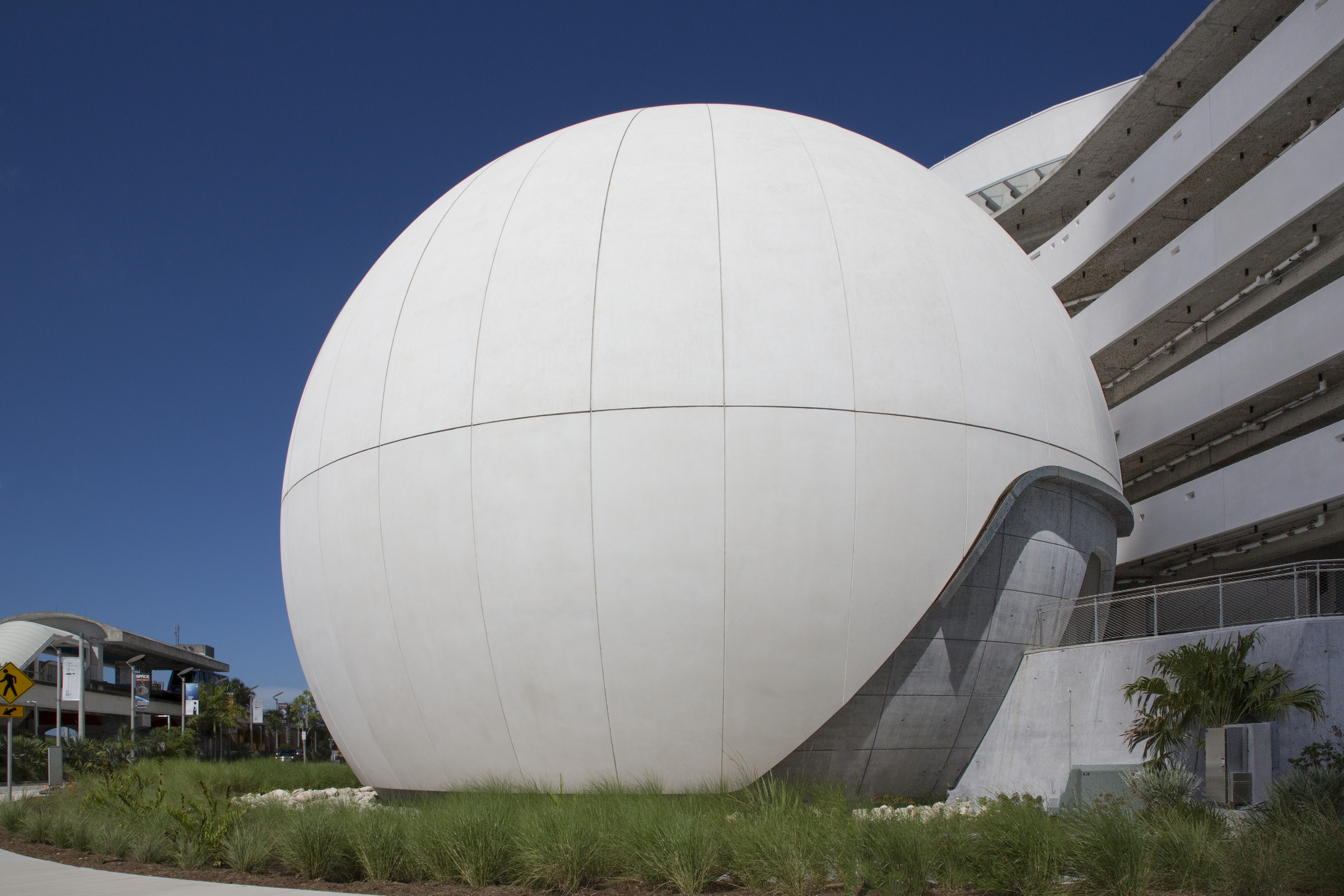 Frost Science is comprised of four interconnected structures, oriented on the site to maximize natural breezes off Biscayne Bay and shaded outdoor spaces, creating areas where visitors can comfortably congregate and enjoy the surroundings. At the heart of the campus is the planetarium, a 67-foot-diameter self-supporting sphere, which serves as the main visual focal point. “After looking at a steel structure to support cladding panels of different materials, and considering a shotcrete dome, self-supporting spherical precast concrete structural panels proved to be the most cost effective solution. It provided the density required for acoustics, the durable structure, and a light sandblast finish that was the perfect projection surface,” said James Palma of Rodriguez and Quiroga Architects.