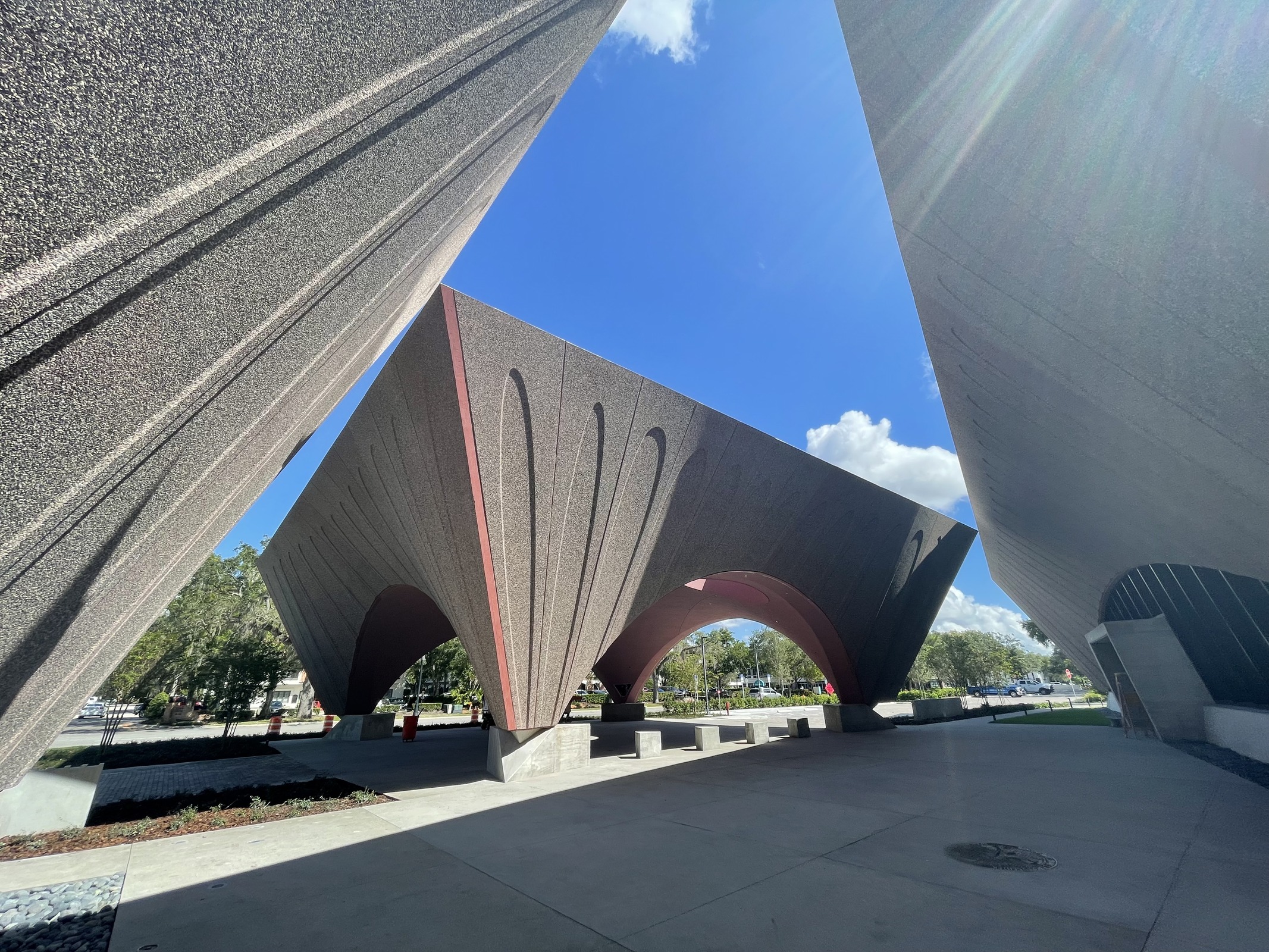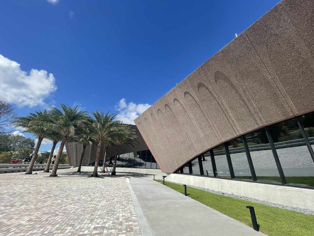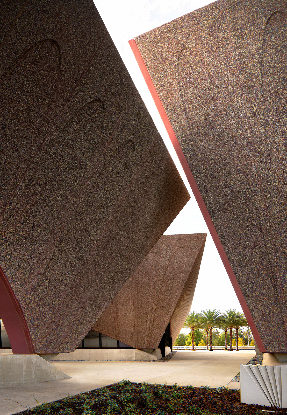 With its angled exterior walls and shaded indoor-outdoor space, the Winter Park Library and Events Center is truly state-of-the-art. As part of an extensive revitalization of a 23-acre public park, the new civic and cultural hub comprises a two-story library, an events center, and a portico that welcomes visitors from the street. Rose-pigmented prefabricated concrete gives this trio of pavilions a distinctive look, with outer walls that lean outward as they rise from the base.