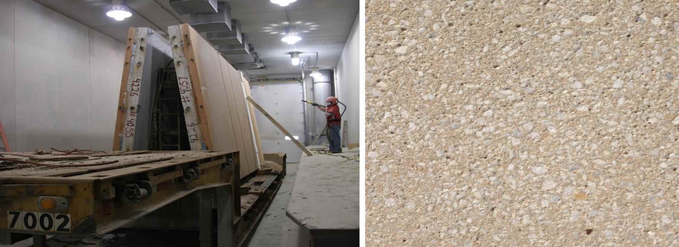 The sandblast process is similar to acid etching where the panel is brought to an indoor finishing bay for final treatment after being stripped from the forms. The difference is instead of using acid to etch the surface, a blasting material (commonly sand) is used to abrade away the surface. This typically frosts and lightens the surface. A sandblast finish is a moderately abrasive finish that provides a good balance of the entire mixture by exposing the cement color, sands, and large aggregates.
